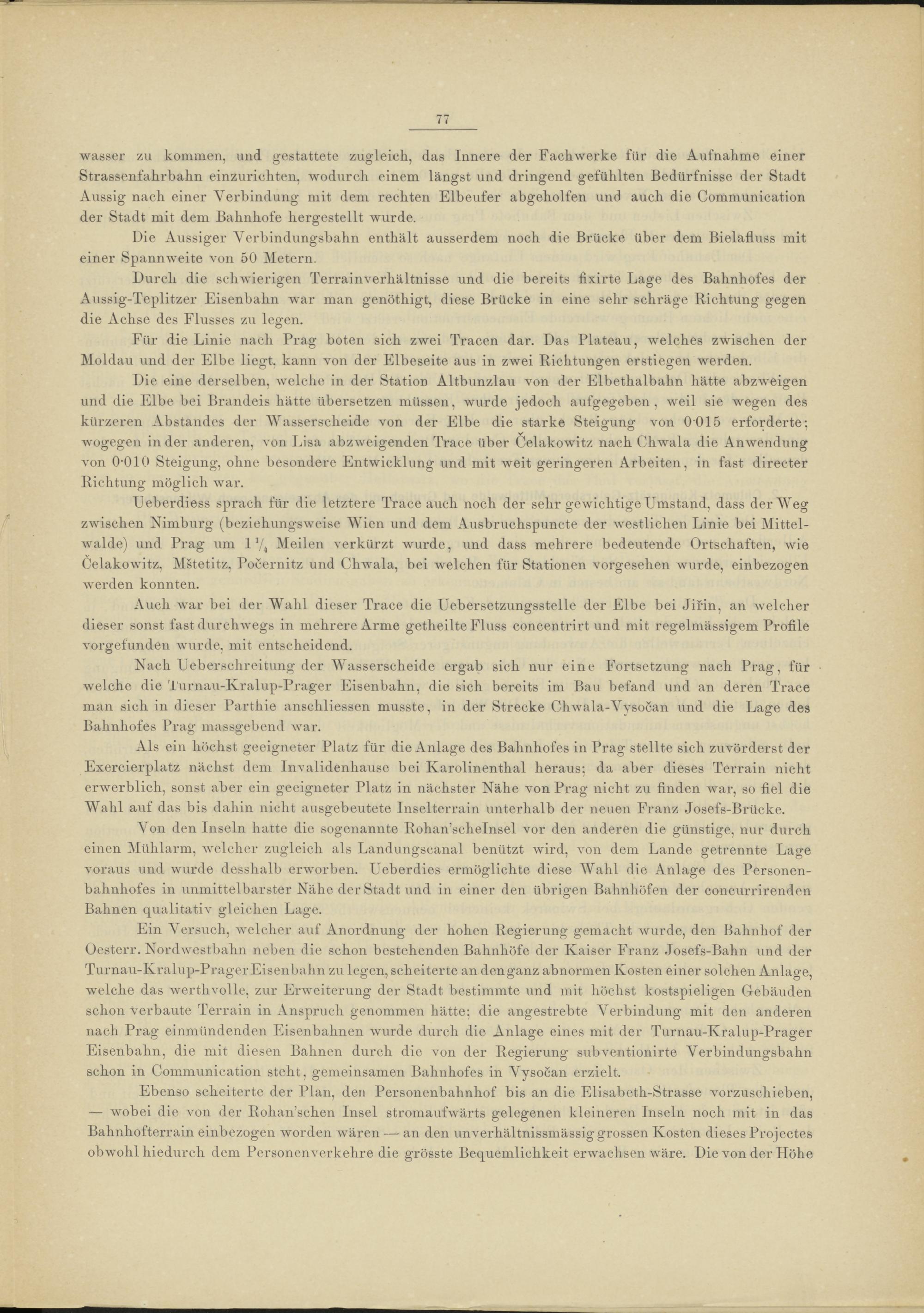 Nach Ueberschreitung der Wasserscheide ergab sich nur eine Fortsetzung nach Prag, für • welche die Turnau-Kralup-Prager Eisenbahn, die sich bereits im Bau befand und an deren Trace man sich in dieser Parthie anschliessen musste, in der Strecke Chwala-Vysoöan und die Lage des Bahnhofes Prag massgebend war.