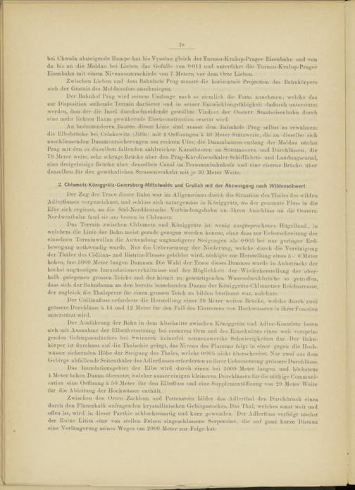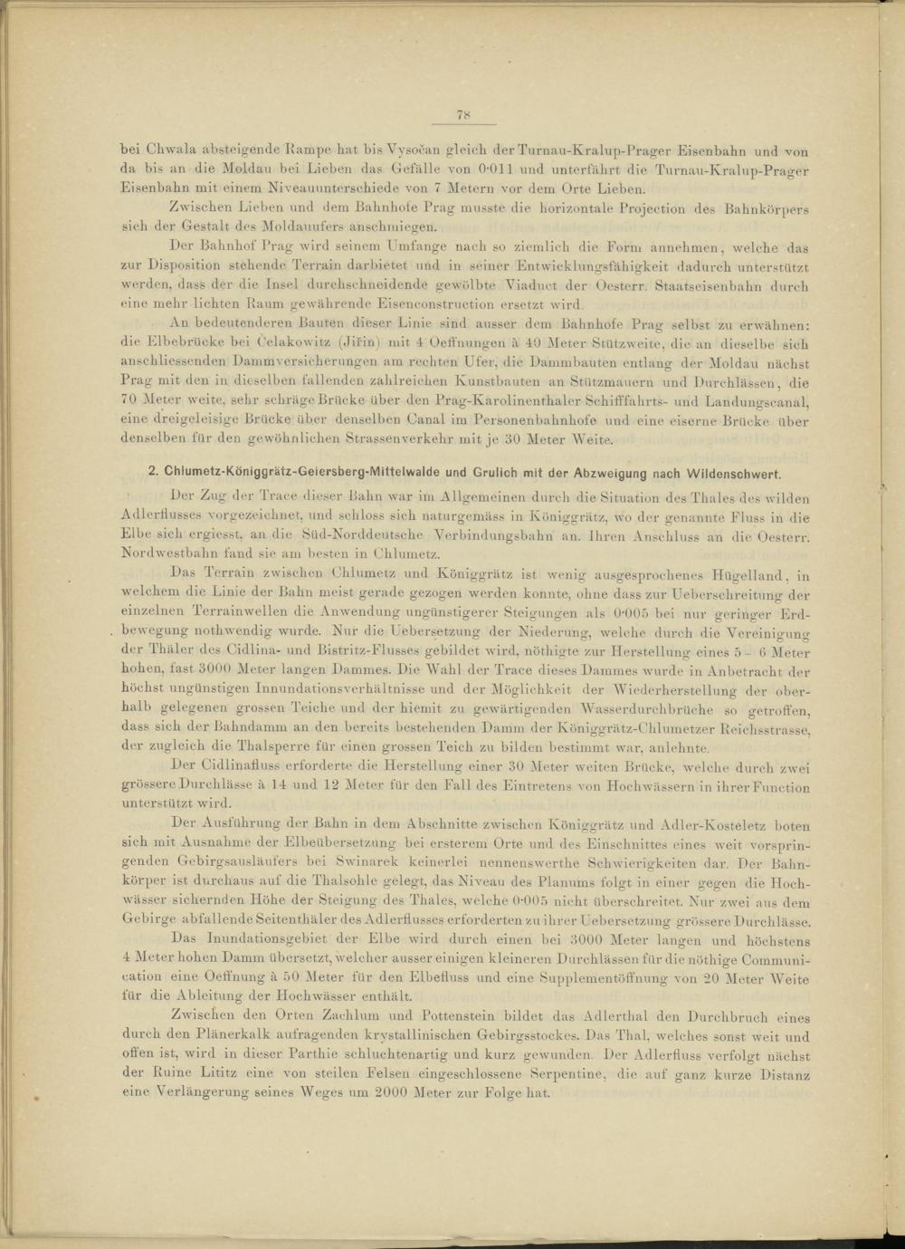 Der Ausführung der Bahn in dem Abschnitte zwischen Königgrätz und Adler-Kostelet-z boten sich mit Ausnahme der Elbeübersetzung bei ersterem Orte und des Einschnittes eines weit vorspringenden Gebirgsausläufers bei Swinarek keinerlei nennenswerthe Schwierigkeiten dar. Der Bahnkörper ist durchaus auf die Thalsohle gelegt, das Niveau des Planums folgt in einer gegen die Hochwässer sichernden Höhe der Steigung des Thaies, welche 0-005 nicht überschreitet. Nur zwei aus dem Gebirge abfallende Seitenthäler des Adlerflusses erforderten zu ihrer Uebersetzung grössere Durchlässe.