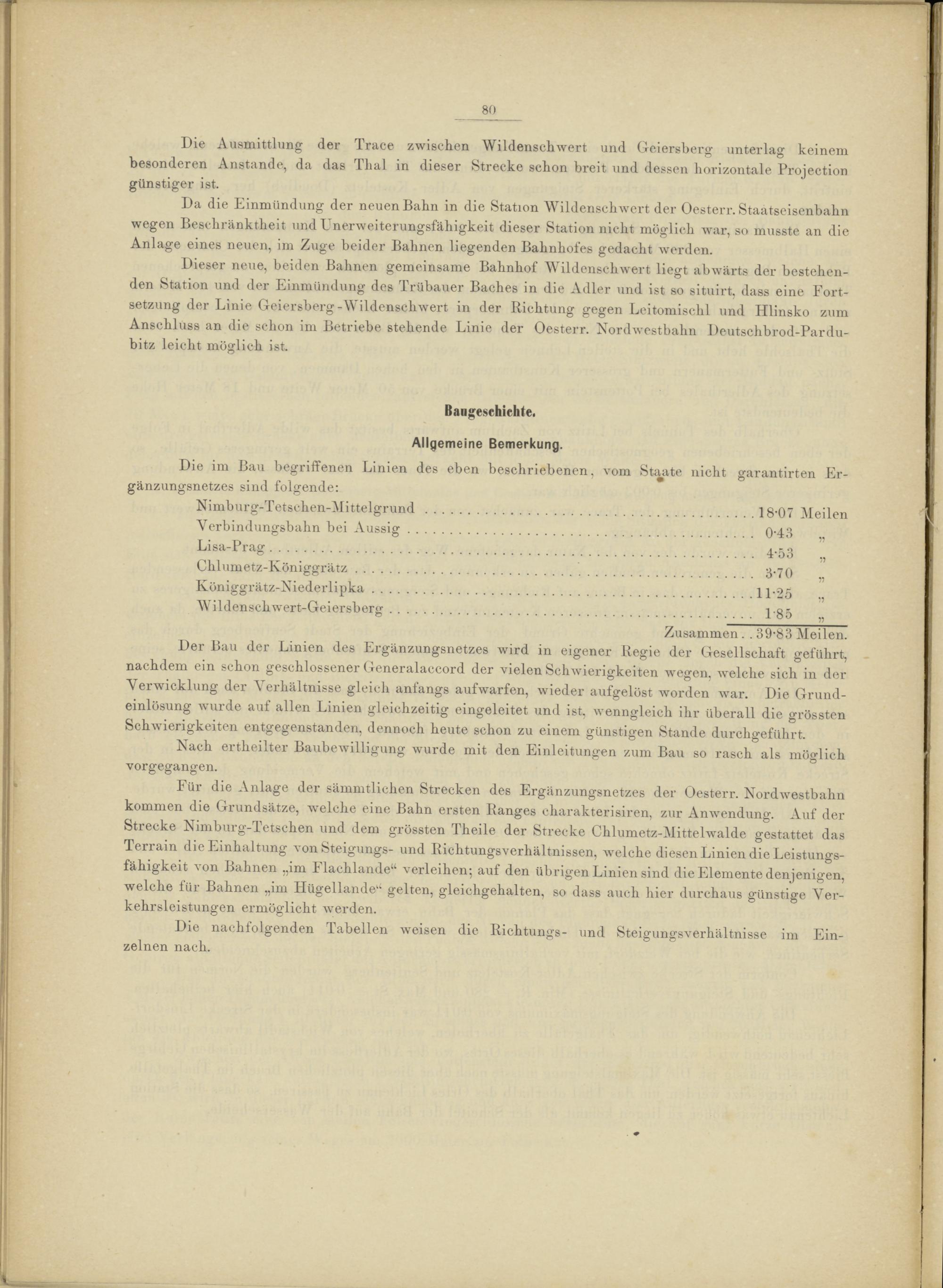 Für die Anlage der sämmtlichen Strecken des Ergänzungsnetzes der Oesterr. Nordwestbahn kommen die Grundsätze, welche eine Bahn ersten Ranges eharakterisiren, zur Anwendung. Auf der Strecke Nimburg-Tetschen und dem grössten Theile der Strecke Chlumetz-Mittelwalde gestattet das Terrain die Einhaltung von Steigungs- und Richtungsverhältnissen, welche diesen Linien die Leistungsfähigkeit von Bahnen „im Flachlande 14 verleihen*, auf den übrigen Linien sind die Elemente denjenigen, welche für Bahnen „im Hügellande 14 gelten, gleichgehalten, so dass auch hier durchaus günstige Verkehrsleistungen ermöglicht werden.