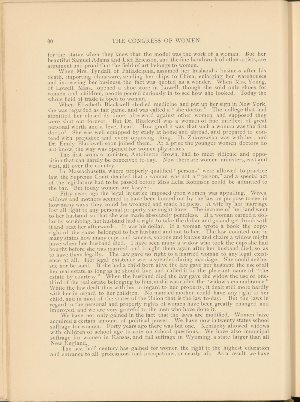 Fifty years ago the legal injustice imposed upon women was appalling. Wives, widow's and mothers seemed to have been hunted out by the law on purpose to see in how many ways they could be wronged and made helpless. A wife by her marriage lost all right to any personal property she might have. The income of her land went to her husband, so that she was made absolutely penniless. If a woman earned a dollar by scrubbing, her husband had a right to take the dollar and go and get drunk with it and beat her afterwards. It was his dollar. If a woman wrote a book the copyright of the same belonged to her husband and not to her. The law counted out in many states how many cups and saucers, spoons and knives and chairs a widow might have when her husband died. I have seen many a widow who took the cups she had bought before she was married and bought them again after her husband died, so as to have them legally. The law gave no right to a married woman to any legal existence at all. Her legal existence was suspended during marriage. She could neither sue nor be sued. If she had a child born alive the law gave her husband the use of all her real estate as long as he should live, and called it by the pleasant name of “ the estate by courtesy.” When the husband died the law gave the widow the use of one- third of the real estate belonging to him, and it was called the “widow’s encumbrance.” While the law dealt thus with her in regard to her property, it dealt still more hardly with her in regard to her children. No married mother could have any right to her child, and in most of the states of the Union that is the law to-day. But the laws in regard to the personal and property rights of women have been greatly changed and improved, and we are very grateful to the men who have done it.