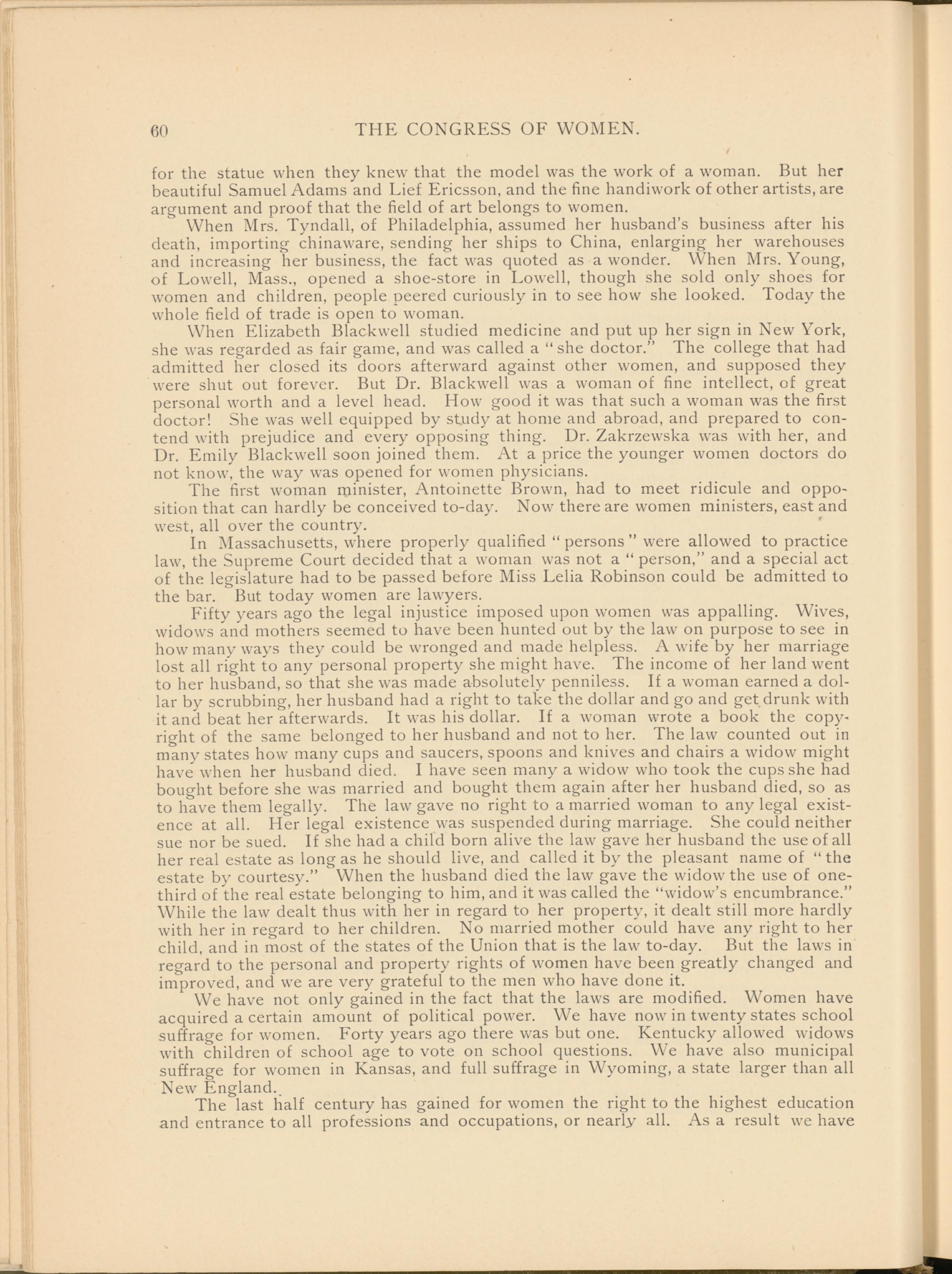 We have not only gained in the fact that the laws are modified. Women have acquired a certain amount of political power. We have now in twenty states school suffrage for women. Forty years ago there was but one. Kentucky allowed widows with children of school age to vote on school questions. We have also municipal suffrage for women in Kansas, and full suffrage in Wyoming, a state larger than all New England.
