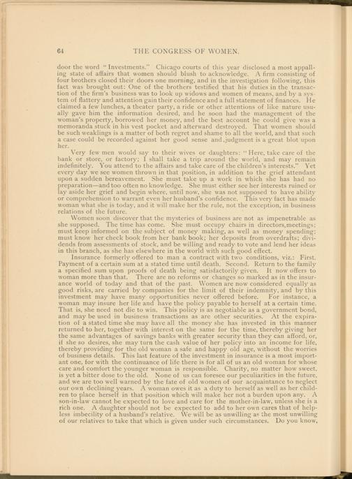 Women soon discover that the mysteries of business are not as impenetrable as she supposed. The time has come. She must occupy chairs in directors,meetings; must keep informed on the subject of money making, as well as money spending; must know her check book from her bank book; her deposits from overdrafts; dividends from assessments of stock, and be willing and ready to vote and lend her ideas in this branch, as she has elsewhere in the world with such good effect.