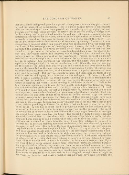 that by a small saving each year for a period of ten years a woman may place herself beyond the accident of dependence. This is a much happier future to contemplate than the uncertainty of some one’s possible care, whether given grudgingly or not. Insurance for women today provides an estate left, in case of death, a savings bank for her money, and a guaranteed annuity for old age; yet there are women who are sentimental enough to not only deny themselves such a provision, but who will induce husbands to cancel any they may have, and too often live to repent their folly. Let me tell you another story—my stories are all true ones, by the way: A woman of more than ordinary business ability in a western town was approached by a real estate man who knew of her contemplation of investing a sum of money she had received. He suggested the purchase of a three-thousand-dollar piece of property that was then rented at ten per cent of the value, or three hundred dollars a year; he showed her that by a few repairs needed this property would bring her four hundred and fifty dollars a year, or fifteen per cent of her investment. Fifteen per cent on money invested is always a temptation to man and woman both, and our western woman was not an exception. She purchased the property and the agent then set about the repairs and changes required to secure an advance rent. When the new roof was put on, the sides of the house cried out for paint, and when that was done the fence fell down with shame before the new clothes of the house; and so it went. The house was entirely remodeled; time was lost, as the tenants were compelled to move and new ones must be secured. But they were finally secured, and then came the trials of our woman investor in keeping peace between tenants and agent. She resolved herself into a peace committee and lay awake nights thinking out plans to ameliorate the woes of first one and then the other, all the time paying the agent for services rendered in keeping her tenants either moving in the house or out of it. Well, to be brief, she cast up her accounts one day last month, and, during the time, two years, she had made a net profit of one dollar and fifty cents upon her investment. I could give you her name and address that you might verify my statement, but you do not need my case, there are hundreds of your own knowledge that are parallel. Had this woman invested one-tenth of her three thousand dollars in some large and secure insurance company two years ago, the dividends of that company would have been almost forty per cent of her investment, and she need not have added lines of care to her face in the endeavor to keep her money making one dollar and fifty cents in two years, besides providing an income for her future that would not require the services of an agent. A wife has as much need to provide an estate for her children by the means of an investment in some insurance company as has the husband. She ought to have a sum of money to leave her children that they might have the advantages she would have given them had she lived. The husband is more helpless when left alone with the children to rear than a wife; he cannot adapt his hours of bread-winning and home-making as can a woman when left alone to face the world. Too often children are scattered or given into the care of unwilling relatives to be cared or uncared for, as the case may be; home ties are broken, affections alienated, ignorance encouraged, and crime often follows the loss of a mother’s care or the provision she may have made to complete the plans for her children. Every woman in this great and good republic should insure, for has she not the same right to accumulate a competence as has man, and in this branch her rights are equal, her returns as great, and her provisions for self and others just as beneficent as man’s. Real estate may decline in value and at best brings but small returns, a failure to pay one deferred payment loses all, if an hour of need comes it is a burden; but insurance is co-operation. If you die your children never needed money more than when death and sickness hampers their grief-stricken efforts; they may draw from the accumulated resources of thousands of others a fund carefully secured against loss, says one of the wisest business men of the times. Loan associations have enabled poor women to build a home, they have made her pay for it to be sure, and she has struggled through a term of eight to ten years for this end; had death overtaken her all would have been lost unless she