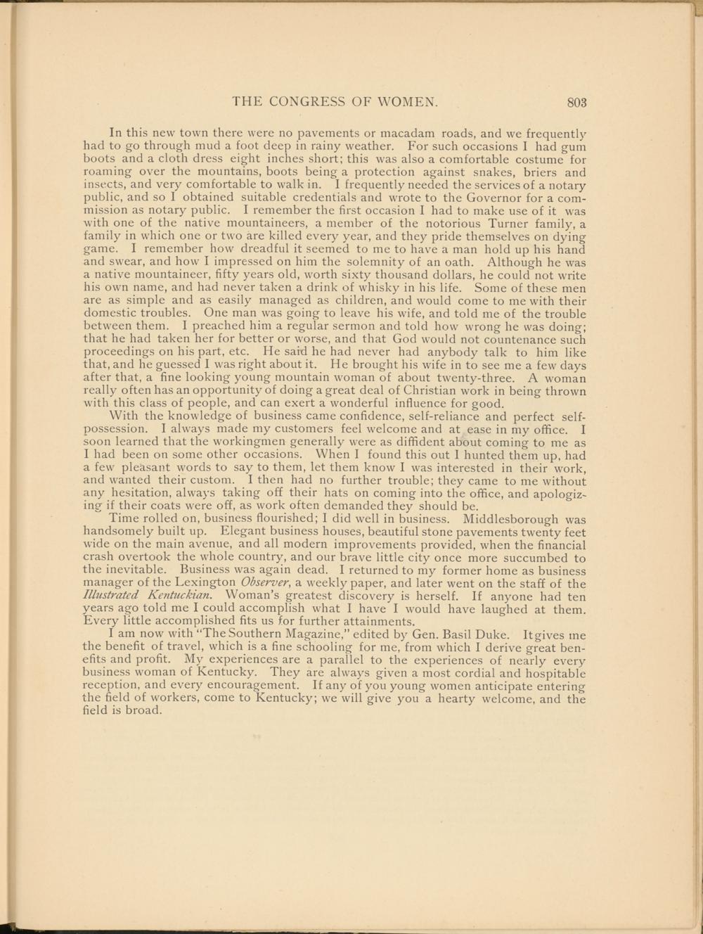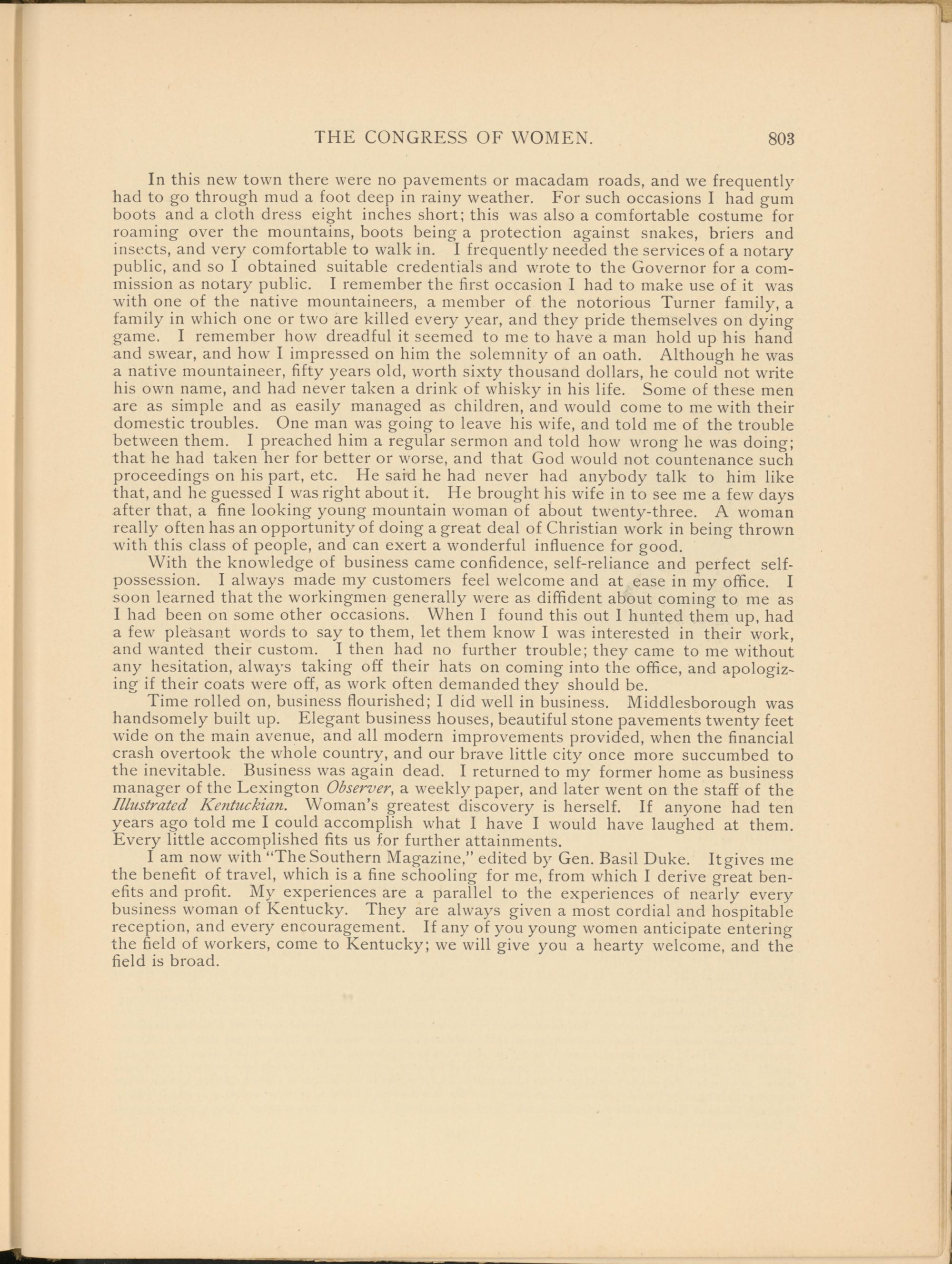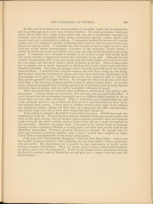 I am now with “The Southern Magazine,” edited by Gen. Basil Duke. It gives me the benefit of travel, which is a fine schooling for me, from which I derive great benefits and profit. My experiences are a parallel to the experiences of nearly every business woman of Kentucky. They are always given a most cordial and hospitable reception, and every encouragement. If any of you young women anticipate entering the field of workers, come to Kentucky; we will give you a hearty welcome, and the field is broad.
