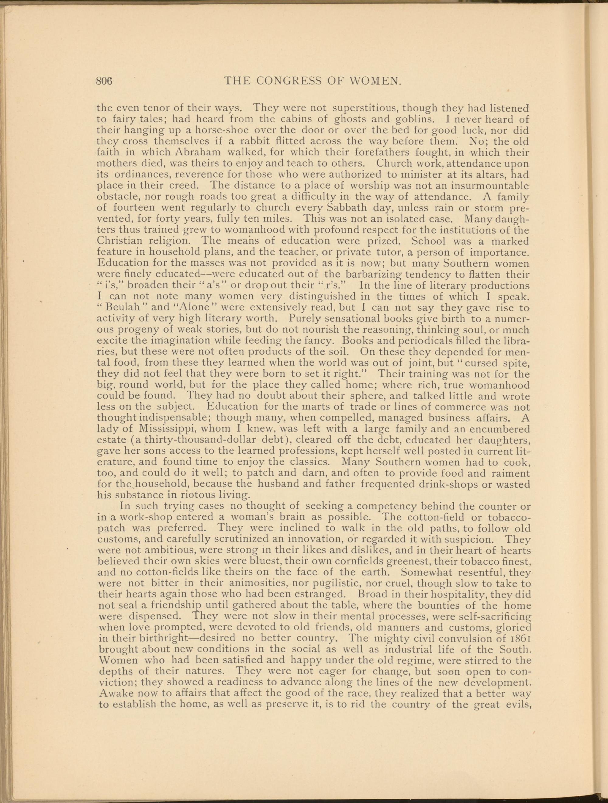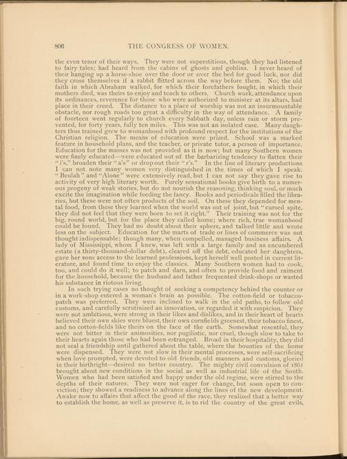 the even tenor of their ways. They were not superstitious, though they had listened to fairy tales; had heard from the cabins of ghosts and goblins. I never heard of their hanging up a horse-shoe over the door or over the bed for good luck, nor did they cross themselves if a rabbit flitted across the way before them. No; the old faith in which Abraham walked, for which their forefathers fought, in which their mothers died, was theirs to enjoy and teach to others. Church work, attendance upon its ordinances, reverence for those who wmre authorized to minister at its altars, had place in their creed. The distance to a place of worship was not an insurmountable obstacle, nor rough roads too great a difficulty in the way of attendance. A family of fourteen went regularly to church every Sabbath day, unless rain or storm prevented, for forty years, fully ten miles. This was not an isolated case. Many daughters thus trained grew to womanhood with profound respect for the institutions of the Christian religion. The means of education were prized. School was a marked feature in household plans, and the teacher, or private tutor, a person of importance. Education for the masses was not provided as it is now; but many Southern women were finely educated—were educated out of the barbarizing tendency to flatten their “ i’s,” broaden their “ a’s” or dropout their “ r’s.” In the line of literary productions I can not note many women very distinguished in the times of which I speak. “ Beulah ” and “Alone ” were extensively read, but I can not say they gave rise to activity of very high literary worth. Purely sensational books give birth to a numerous progeny of weak stories, but do not nourish the reasoning, thinking soul, or much excite the imagination while feeding the fancy. Books and periodicals filled the libraries, but these were not often products of the soil. On these they depended for mental food, from these they learned when the world was out of joint, but “ cursed spite, they did not feel that they were born to set it right.” Their training was not for the big, round world, but for the place they called home; where rich, true womanhood could be found. They had no doubt about their sphere, and talked little and wrote less on the subject. Education for the marts of trade or lines of commerce was not thought indispensable; though many, when compelled, managed business affairs. A lady of Mississippi, whom I knew, was left with a large family and an encumbered estate (a thirty-thousand-dollar debt), cleared off the debt, educated her daughters, gave her sons access to the learned professions, kept herself well posted in current literature, and found time to enjoy the classics. Many Southern women had to cook, too, and could do it well; to patch and darn, and often to provide food and raiment for the household, because the husband and father frequented drink-shops or wasted his substance in riotous living.