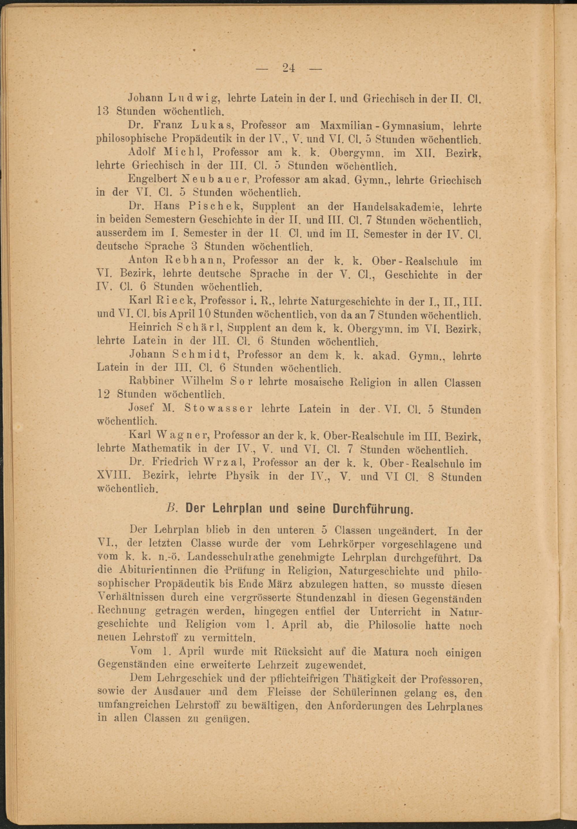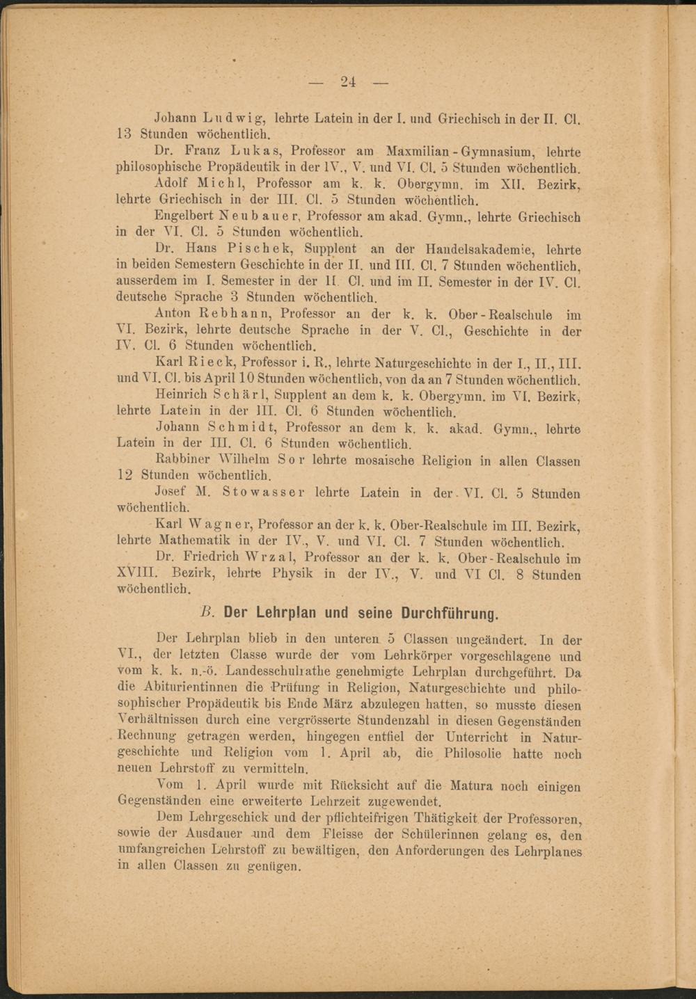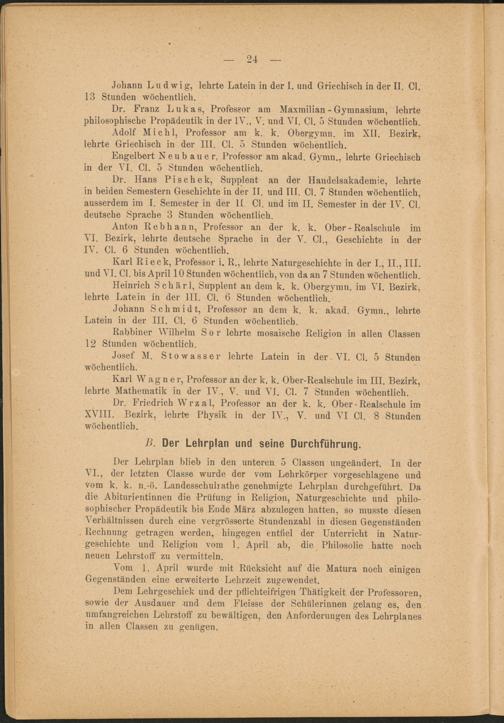 Dr. Franz Lukas, Professor am Maxmilian - Gymnasium, lehrte philosophische Propädeutik in der IV., V. und VI. CI. 5 Stunden wöchentlich.