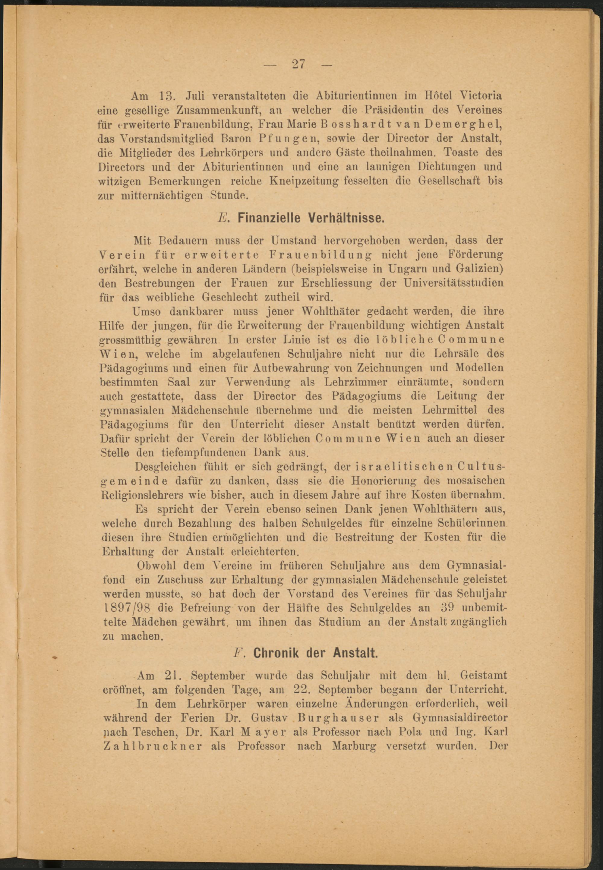 Obwohl dem Vereine im früheren Schuljahre aus dem Gymnasialfond ein Zuschuss zur Erhaltung der gymnasialen Mädchenschule geleistet werden musste, so hat doch der Vorstand des Vereines für das Schuljahr 1897/98 die Befreiung von der Hälfte des Schulgeldes an 39 unbemittelte Mädchen gewährt, um ihnen das Studium an der Anstalt zugänglich zu machen.