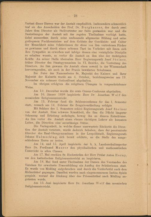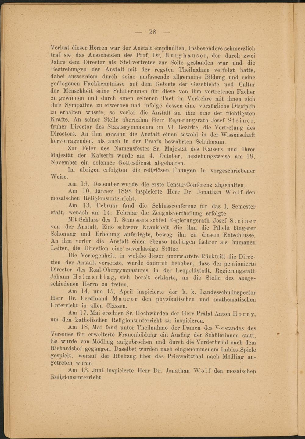 Verlust dieser Herren war der Anstalt empfindlich. Insbesondere schmerzlich traf sie das Ausscheiden des Prof. Dr. Burghauser, der durch zwei Jahre dem Director als Stellvertreter zur Seite gestanden war und die Bestrebungen der Anstalt mit der regsten Theilnahme verfolgt hatte, dabei aussserdem durch seine umfassende allgemeine Bildung und seine gediegenen Fachkenntnisse auf dem Gebiete der Geschichte und Cultur der Menschheit seine Schülerinnen für diese von ihm vertretenen Fächer zu gewinnen und durch einen seltenen Tact im Verkehre mit ihnen sich ihre Sympathie zu erwerben und infolge dessen eine vorzügliche Disciplin zu erhalten wusste, so verlor die Anstalt an ihm eine der tüchtigsten Kräfte. An seiner Stelle übernahm Herr Regierungsrath Josef Steiner, früher Director des Staatsgymnasium im VI. Bezirke, die Vertretung des Directors. An ihm gewann die Anstalt einen sowohl in der Wissenschaft hervorragenden, als auch in der Praxis bewährten Schulmann.