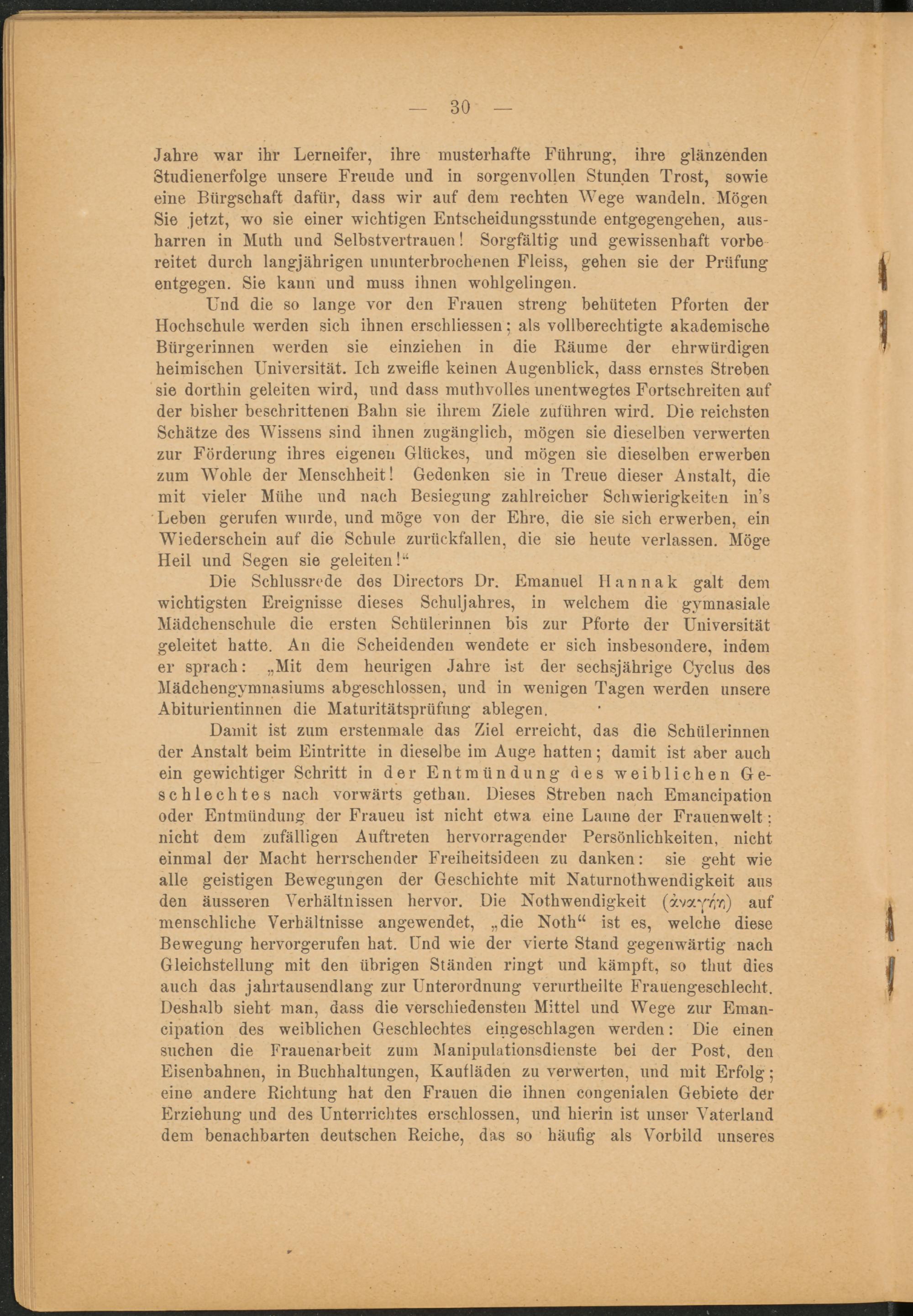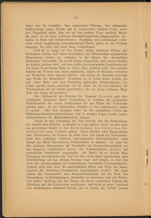 Die Schlussrede des Directors Dr. Emanuel llannak galt dem wichtigsten Ereignisse dieses Schuljahres, in welchem die gymnasiale Mädchenschule die ersten Schülerinnen bis zur Pforte der Universität geleitet hatte. An die Scheidenden wendete er sich insbesondere, indem er sprach: „Mit dem heurigen Jahre ist der sechsjährige Cyclus des Mädchengymnasiums abgeschlossen, und in wenigen Tagen werden unsere Abiturientinnen die Maturitätsprüfung ablegen.