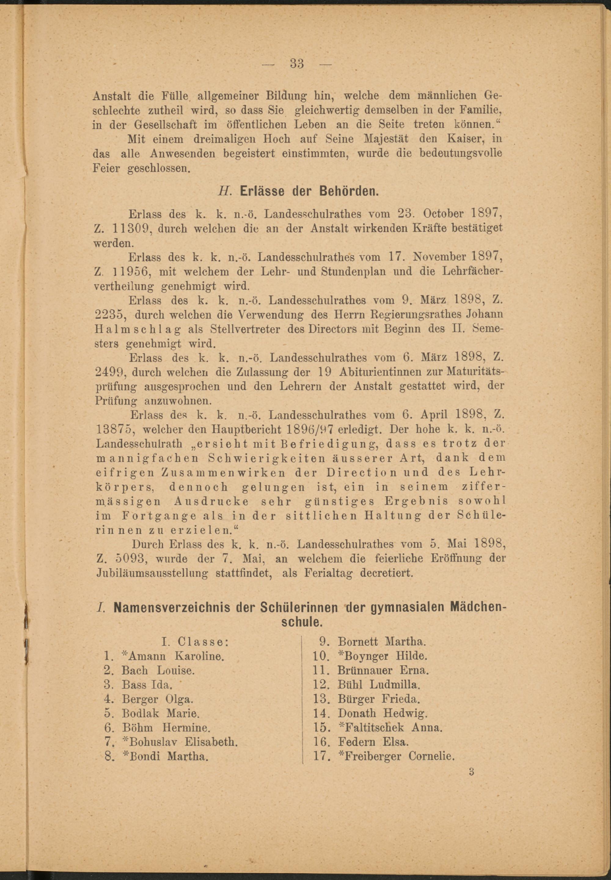 Erlass des k. k. n.-ö. Landesschulrathes vom 6. April 1898, Z. 13875, welcher den Hauptbericht 1896/07 erledigt. Der hohe k. k. n.-ö. Landesschulrath „er sieht mi t Be friedigung, dass es trotz der mannigfachen Schwierigkeiten äusserer Art, dank dem eifrigen Zusammenwirken der Direction und des Lehrkörpers, dennoch gelungen ist, ein in seinem ziffer- m.ässigen Ausdrucke sehr günstiges Ergebnis sowohl im Fortgange als in der sittlichen Haltung der Schülerinnen zu erzielen.“