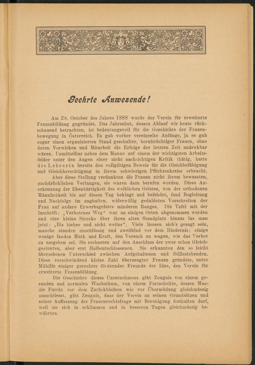 Am 28. October des Jahres 1888 wurde der Verein für erweiterte Frauenbildung gegründet. Das Jahrzehnt, dessen Ablauf wir heute rückschauend betrachten, ist bedeutungsvoll für die Geschichte der Frauenbewegung in Österreich. Es gab vorher vereinzelte Anfänge, ja es gab sogar einen organisierten Stand geschulter, berufstüchtiger Frauen, ohne deren Vorwirken und Mitarbeit die Erfolge der letzten Zeit undenkbar wären. Unmittelbar neben dem Manne auf einem der wichtigsten Arbeitsfelder unter den Augen einer nicht nachsichtigen Kritik tliätig, hatte die Lehrerin bereits den vollgiltigen Beweis für die Gleichbefähigung und Gleichberechtigung in ihrem schwierigen Pflichtenkreise erbracht.