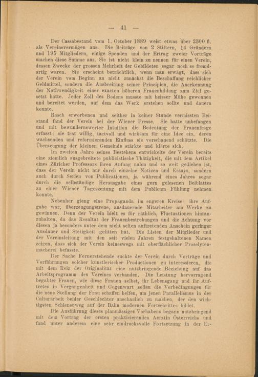 Der Cassabestand vom 1. October 1889 weist etwas über 2300 fl. als Vereinsvermögen aus. Die Beiträge von 2 Stiftern, 14 Gründern und 195 Mitgliedern, einige Spenden und der Ertrag zweier Vorträge machen diese Summe aus. Sie ist nicht klein zu nennen für einen Verein, dessen Zwecke der grossen Mehrheit der Gebildeten sogar noch so fremdartig waren. Sie erscheint beträchtlich, wenn man erwägt, dass sich der Verein vom Beginn an nicht zunächst die Beschaffung reichlicher Geldmittel, sondern die Ausbreitung seiner Principien, die Anerkennung der Nothwendigkeit einer exacten höheren Frauenbildung zum Ziel gesetzt hatte. Jeder Zoll des Bodens musste mit heisser Mühe gewonnen und bereitet werden, auf dem das Werk erstehen sollte und dauern konnte.