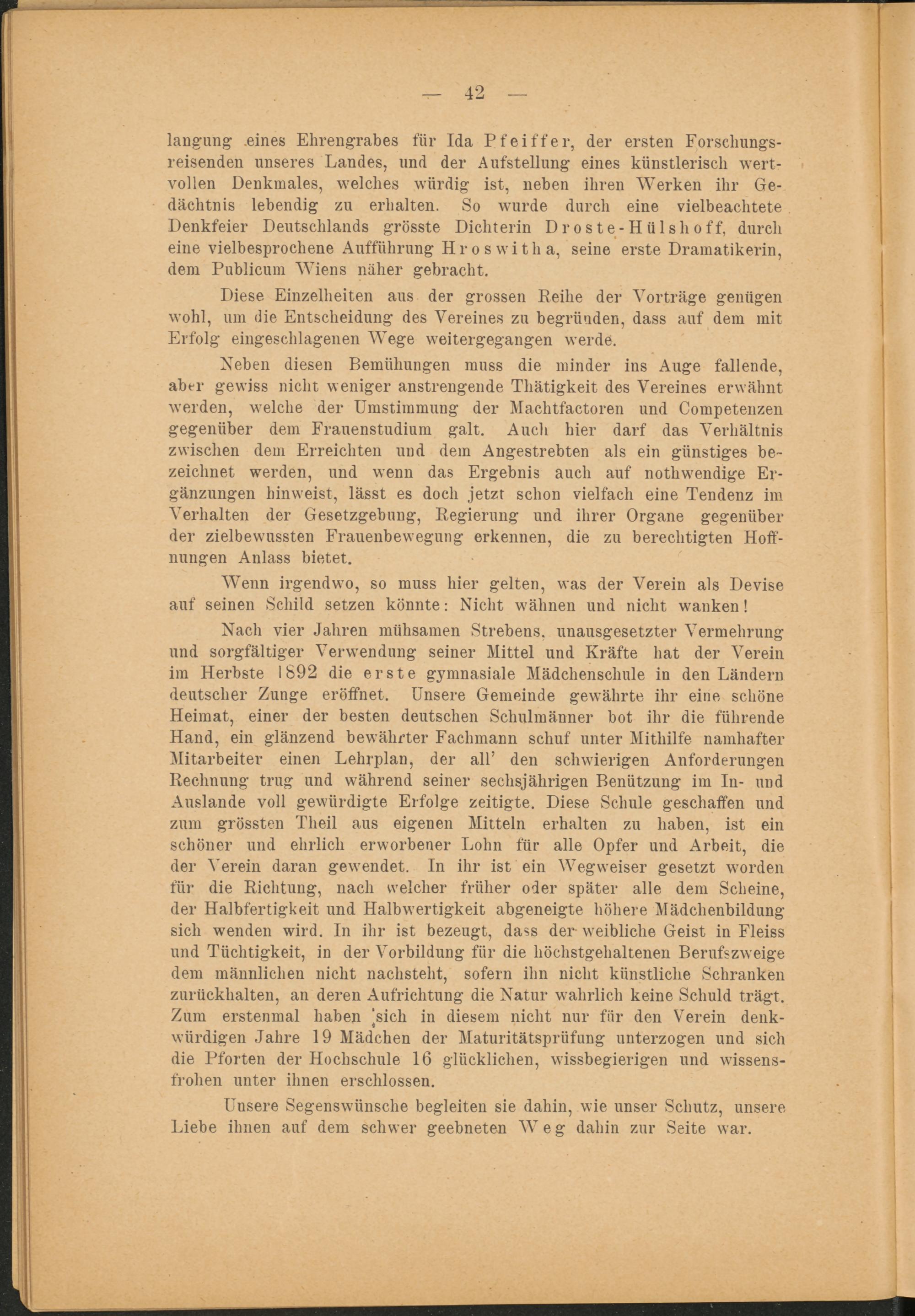 Nach vier Jahren mühsamen Strebens. unausgesetzter Vermehrung und sorgfältiger Verwendung seiner Mittel und Kräfte hat der Verein im Herbste 1892 die erste gymnasiale Mädchenschule in den Ländern deutscher Zunge eröffnet. Unsere Gemeinde gewährte ihr eine schöne Heimat, einer der besten deutschen Schulmänner bot ihr die führende Hand, ein glänzend bewährter Fachmann schuf unter Mithilfe namhafter Mitarbeiter einen Lehrplan, der all’ den schwierigen Anforderungen Rechnung trug und während seiner sechsjährigen Benützung im In- und Auslande voll gewürdigte Erfolge zeitigte. Diese Schule geschaffen und zum grössten Theil aus eigenen Mitteln erhalten zu haben, ist ein schöner und ehrlich erworbener Lohn für alle Opfer und Arbeit, die der Verein daran gewendet. In ihr ist ein Wegweiser gesetzt worden für die Richtung, nach welcher früher oder später alle dem Scheine, der Halbfertigkeit und Halbwertigkeit abgeneigte höhere Mädchenbildung sich wenden wird. In ihr ist bezeugt, dass der weibliche Geist in Fleiss und Tüchtigkeit, in der Vorbildung für die höchstgehaltenen Berufszweige dem männlichen nicht nachsteht, sofern ihn nicht künstliche Schranken zurückhalten, an deren Aufrichtung die Natur wahrlich keine Schuld trägt. Zum erstenmal haben ‘sich in diesem nicht nur fiir den Verein denkwürdigen Jahre 19 Mädchen der Maturitätsprüfung unterzogen und sich die Pforten der Hochschule 16 glücklichen, wissbegierigen und wissensfrohen unter ihnen erschlossen.