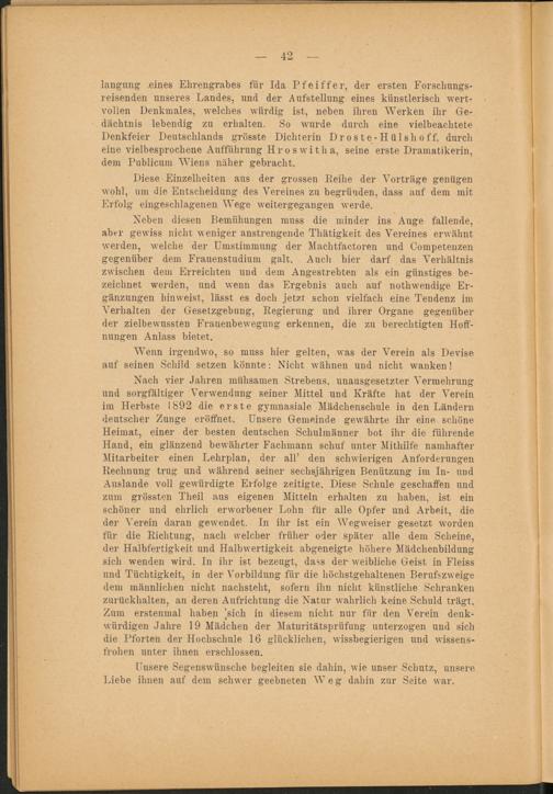 langung .eines Ehrengrabes für Ida Pfeiffer, der ersten Forsclmngs- reisenden unseres Landes, und der Aufstellung eines künstlerisch wertvollen Denkmales, welches würdig ist, neben ihren Werken ihr Gedächtnis lebendig zu erhalten. So wurde durch eine vielbeachtete Denkfeier Deutschlands grösste Dichterin Droste-Hülshoff, durch eine vielbesprochene Aufführung Hroswitha, seine erste Dramatikerin, dem Publicum Wiens näher gebracht.