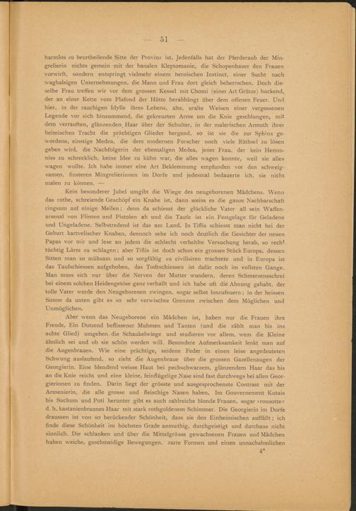 Aber wenn das Neugeborene ein Mädchen ist, haben nur die Frauen ihre Freude. Ein Dutzend beflissener Muhmen und Tanten (und die zählt man bis ins achte Glied) umgeben, die Schaukelwiege und studieren vor allem, wem die Kleine ähnlich sei und ob sie schön werden will. Besondere Aufmerksamkeit lenkt man auf die Augenbrauen. Wie eine prächtige, seidene Feder in einen leise angedeuteten Schwung auslaufend, so zieht die Augenbraue über die grossen Gazellenaugen der Georgierin. Eine blendend weisse Haut bei pechschwarzem, glänzendem Haar das bis an die Knie reicht und eine kleine, feinflügelige Nase sind fast durchwegs bei allen Georgierinnen zu finden. Darin liegt der grösste und ausgesprochenste Contrast mit der Armenierin, die alle grosse und fleischige Nasen haben. Im Gouvernement Kutais bis Suchum und Poti herunter gibt es auch zahlreiche blonde Frauen, sogar »rousotte« d. h. kastanienbraunes Haar mit stark rothgoldenem Schimmer. Die Georgierin im Dorfe draussen ist von so berückender Schönheit, dass sie den Einheimischen auffällt; ich finde diese Schönheit im höchsten Grade anmuthig, durchgeistigt und durchaus nicht sinnlich. Die schlanken und über die Mittelgrösse gewachsenen Frauen und Mädchen haben weiche, geschmeidige Bewegungen, zarte Formen und einen unnachahmlichen