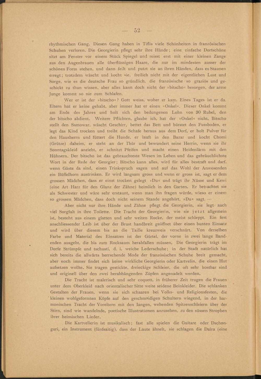 Aber nicht nur ihre Hände und Zähne pflegt die Georgierin, sie legt- auch viel Sorgfalt in ihre Toilette. Die Tracht der Georgierin, wie sie jetzt allgemein ist, besteht aus einem glatten und sehr weiten Rocke, der meist schleppt. Ein fest anschliessender Leib ist über der Brust handbreit geöffnet über einen bunten Einsatz und wird über diesem bis an die Taille kreuzweis verschnürt. Von derselben Farbe und Material des Einsatzes ist der Gürtel, der vorne in zwei lange Bandenden ausgeht, die bis zum Rocksaum herabfallen müssen. Die Georgierin trägt im Dorfe Strümpfe und tschusti, d. i. weiche Lederschuhe; in der Stadt natürlich hat sich bereits die allwärts herrschende Mode der französischen Schuhe breit gemacht, aber noch immer findet sich keine wirkliche Georgierin oder Kartvelin, die einen Hut aufsetzen wollte. Sie tragen gestickte, dreieckige Schleier, die oft sehr kostbar sind und originell über den zwei herabhängenden Zöpfen angenadelt werden.