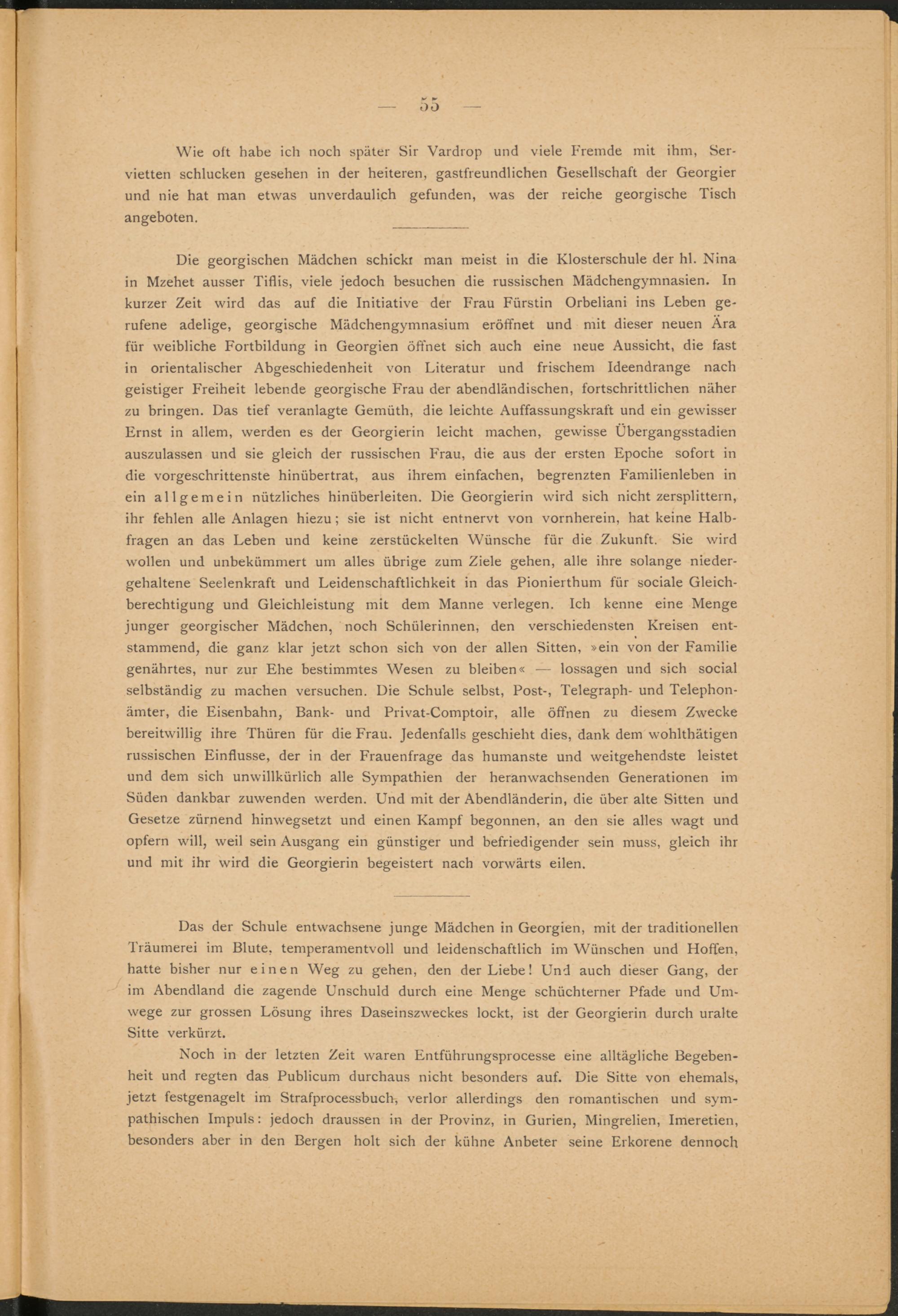 Die georgischen Mädchen schickt man meist in die Klosterschule der hl. Nina in Mzehet ausser Tiflis, viele jedoch besuchen die russischen Mädchengymnasien. In kurzer Zeit wird das auf die Initiative der Frau Fürstin Orbeliani ins Leben gerufene adelige, georgische Mädchengymnasium eröffnet und mit dieser neuen Ara für weibliche Fortbildung in Georgien öffnet sich auch eine neue Aussicht, die fast in orientalischer Abgeschiedenheit von Literatur und frischem Ideendrange nach geistiger Freiheit lebende georgische Frau der abendländischen, fortschrittlichen näher zu bringen. Das tief veranlagte Gemüth, die leichte Auffassungskraft und ein gewisser Ernst in allem, werden es der Georgierin leicht machen, gewisse Ubergangsstadien auszulassen und sie gleich der russischen Frau, die aus der ersten Epoche sofort in die vorgeschrittenste hinübertrat, aus ihrem einfachen, begrenzten Familienleben in ein allgemein nützliches hinüberleiten. Die Georgierin wird sich nicht zersplittern, ihr fehlen alle Anlagen hiezu; sie ist nicht entnervt von vornherein, hat keine Halbfragen an das Leben und keine zerstückelten Wünsche für die Zukunft. Sie wird wollen und unbekümmert um alles übrige zum Ziele gehen, alle ihre solange niedergehaltene Seelenkraft und Leidenschaftlichkeit in das Pionierthum für sociale Gleichberechtigung und Gleichleistung mit dem Manne verlegen. Ich kenne eine Menge junger georgischer Mädchen, noch Schülerinnen, den verschiedensten Kreisen entstammend, die ganz klar jetzt schon sich von der allen Sitten, »ein von der Familie genährtes, nur zur Ehe bestimmtes Wesen zu bleiben« — lossagen und sich social selbständig zu machen versuchen. Die Schule selbst, Post-, Telegraph- und Telephonämter, die Eisenbahn, Bank- und Privat-Comptoir, alle öffnen zu diesem Zwecke bereitwillig ihre Thüren für die Frau. Jedenfalls geschieht dies, dank dem wohlthätigen russischen Einflüsse, der in der Frauenfrage das humanste und weitgehendste leistet und dem sich unwillkürlich alle Sympathien der heranwachsenden Generationen im Süden dankbar zuwenden werden. Und mit der Abendländerin, die über alte Sitten und Gesetze zürnend hinwegsetzt und einen Kampf begonnen, an den sie alles wagt und opfern will, weil sein Ausgang ein günstiger und befriedigender sein muss, gleich ihr und mit ihr wird die Georgierin begeistert nach vorwärts eilen.