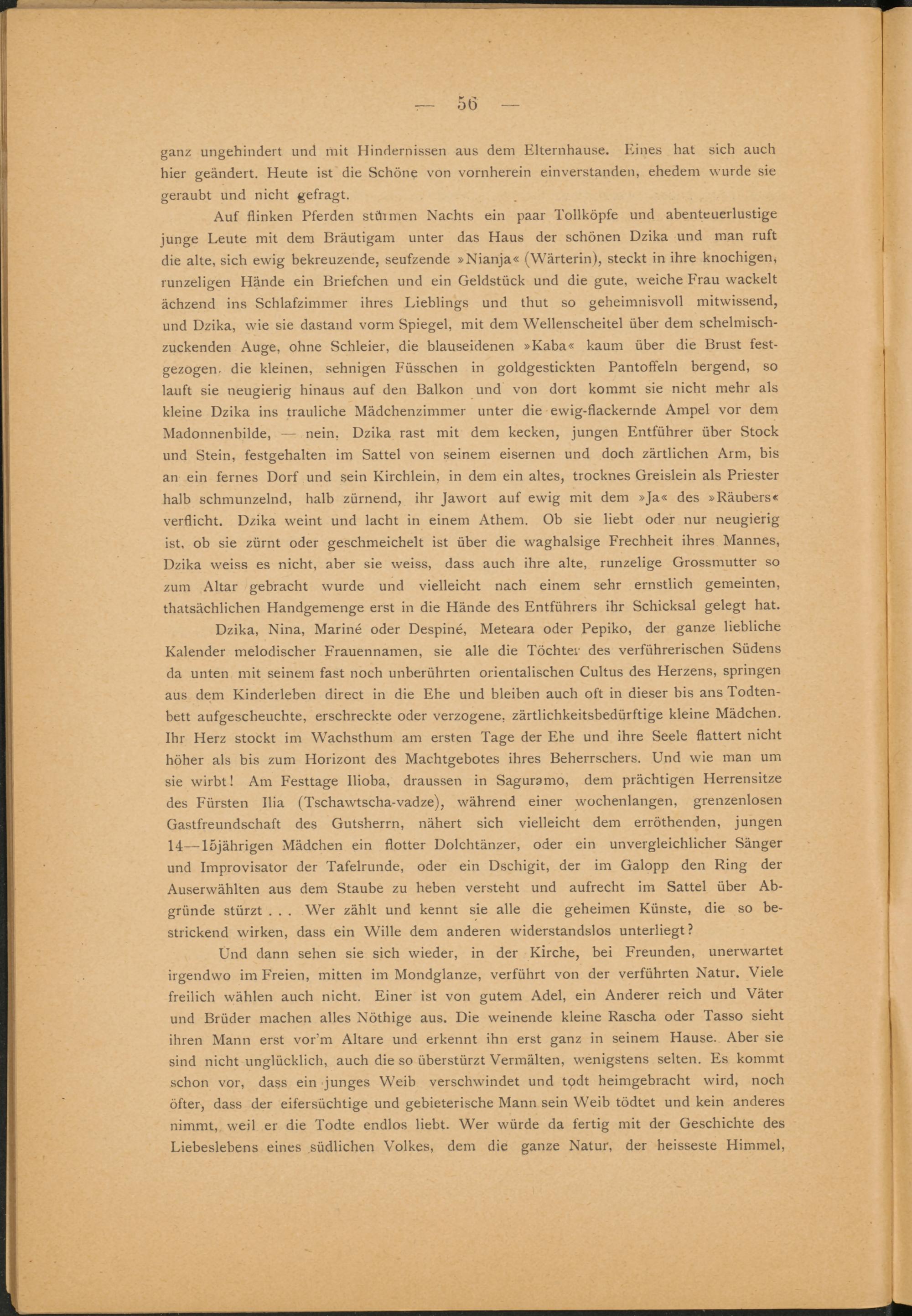 Dzika, Nina, Marine oder Despine, Meteara oder Pepiko, der ganze liebliche Kalender melodischer Frauennamen, sie alle die Töchter des verführerischen Südens da unten mit seinem fast noch unberührten orientalischen Cultus des Herzens, springen aus dem Kinderleben direct in die Ehe und bleiben auch oft in dieser bis ans Todten- bett aufgescheuchte, erschreckte oder verzogene, zärtlichkeitsbedürftige kleine Mädchen. Ihr Herz stockt im Wachsthum am ersten Tage der Ehe und ihre Seele flattert nicht höher als bis zum Horizont des Machtgebotes ihres Beherrschers. Und wie man um sie wirbt! Am Festtage Ilioba, draussen in Saguramo, dem prächtigen Herrensitze des Fürsten Ilia (Tschawtscha-vadze), während einer wochenlangen, grenzenlosen Gastfreundschaft des Gutsherrn, nähert sich vielleicht dem erröthenden, jungen 14—15jährigen Mädchen ein flotter Dolchtänzer, oder ein unvergleichlicher Sänger und Improvisator der Tafelrunde, oder ein Dschigit, der im Galopp den Ring der