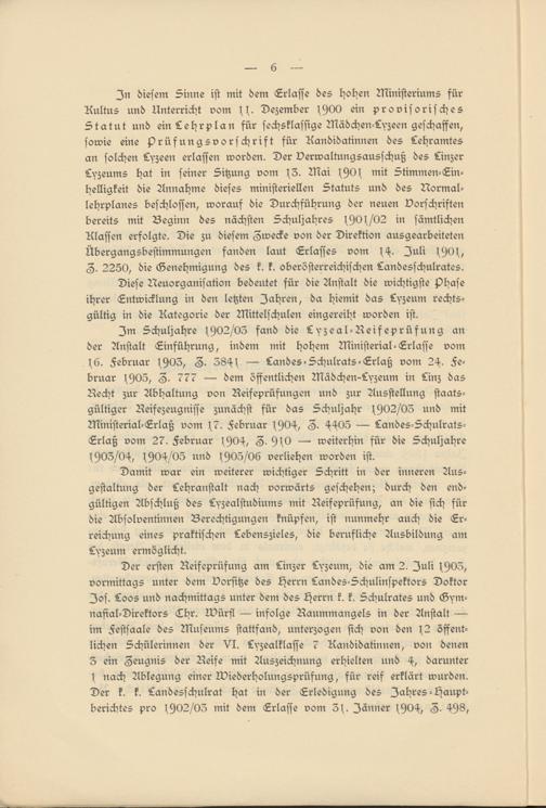 Im Schuljahre 1902/03 fand die Lyzeal-Reifeprüfung an der Anstalt Einführung, indem mit hohem Ministerial-Erlasse vom 16. Februar 1903, Z. 38^1 — Landes-Schulrats-Erlaß vom 2H. Februar 1905, Z. 277 — dem öffentlichen Mädchen-Lyzeum in Linz das Recht zur Abhaltung von Reifeprüfungen und zur Ausstellung staats- gültiger Reifezeugnisse zunächst für das Schuljahr 1902/03 und mit Ministerial-Erlaß vom 17. Februar 190H, A. H^05 — Landes-Schulrats- Lrlaß vom 27. Februar 190^, Z. 910 —- weiterhin für die Schuljahre 1903/0H, 190^/05 und 1905/06 verliehen worden ist.
