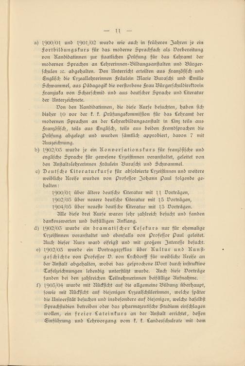d) l902/03 wurde je ein Konversationskurs für französische unö englische Sprache für gewesene Lyzeistinnen veranstaltet, geleitet von den Anstaltslehrerinnen Fräulein Buraschi und Schwämme!, c) Deutsche Literaturkurse für absolvierte Lyzeistinnen und weitere weibliche Kreise wurden von Professor Johann Paul folgende gehalten :