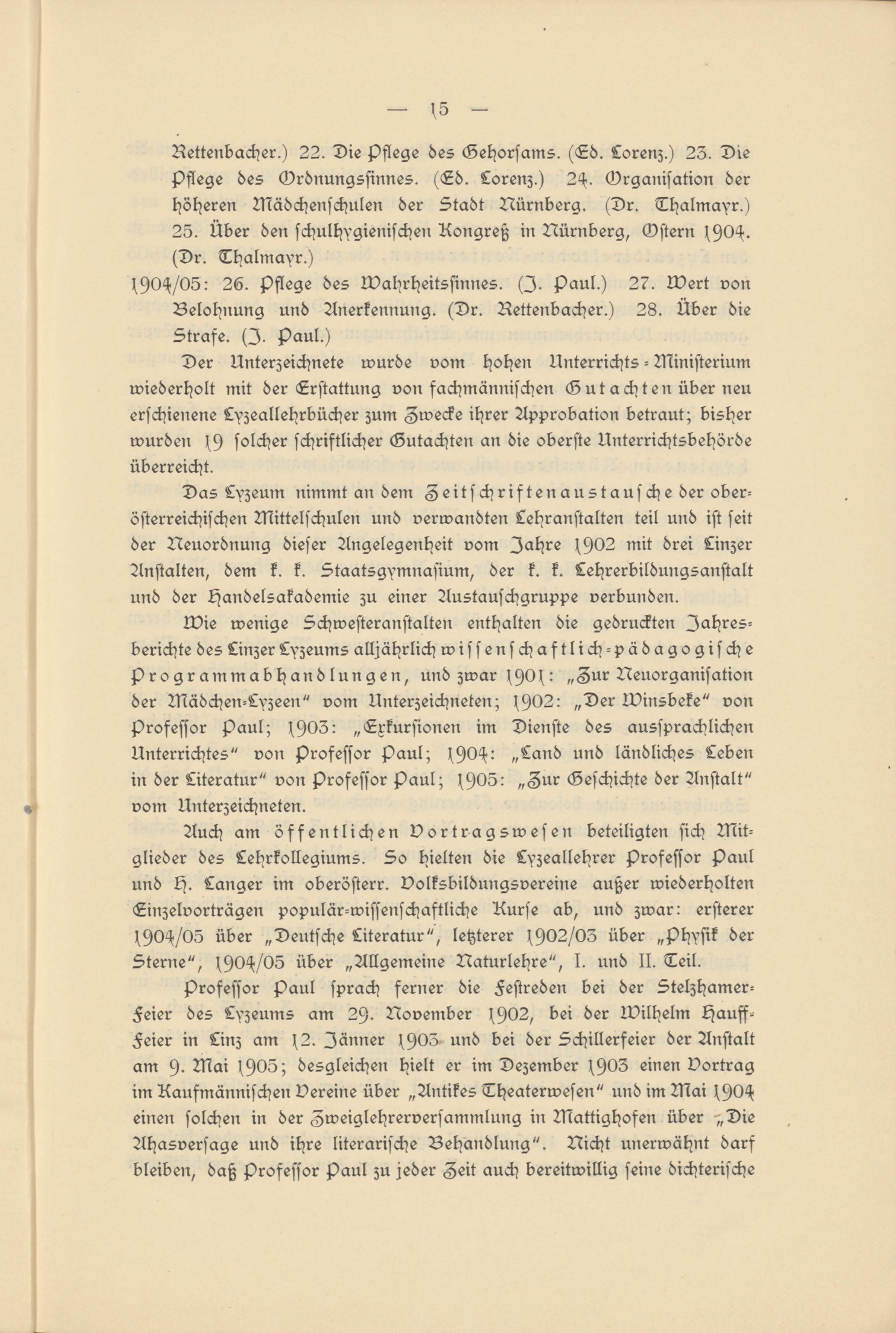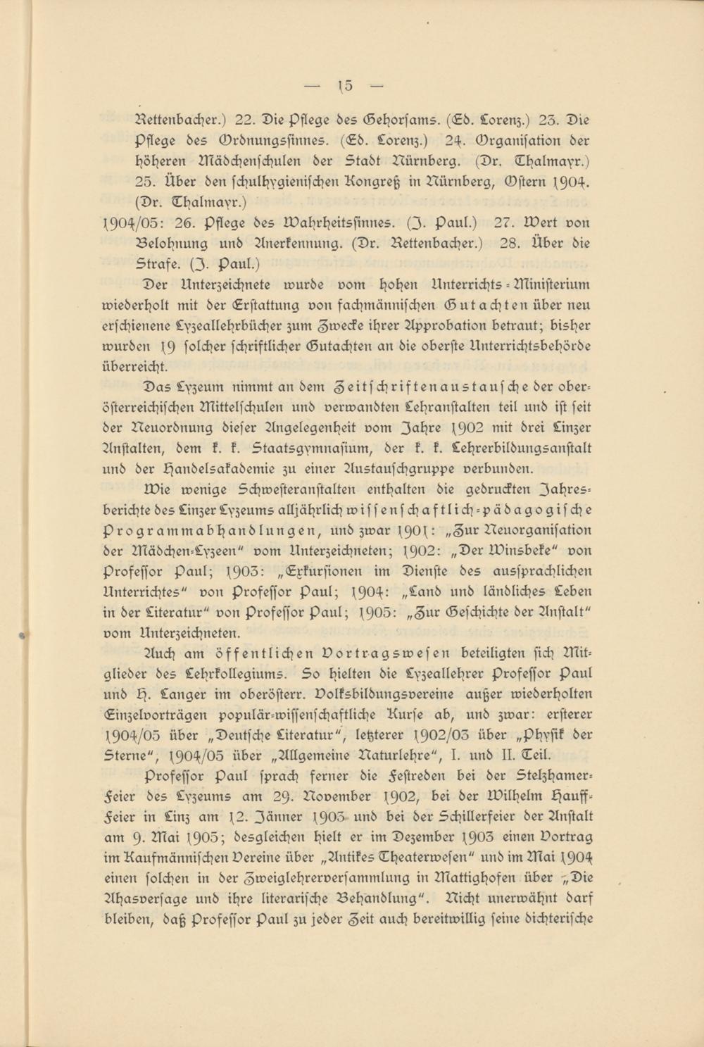 Auch am öffentlichen vortragswesen beteiligten sich Mitglieder des Lehrkollegiums. So hielten die Lyzeallehrer Professor Paul und H. Langer im oberösterr. Volksbildungsvereine außer wiederholten Einzelvorträgen populär-wissenschaftliche Kurse ab, und zwar: ersterer (90^/05 über „Deutsche Literatur", letzterer (902/03 über „Physik der Sterne", (90H/05 über „Allgemeine Naturlehre", I. und II. Teil.