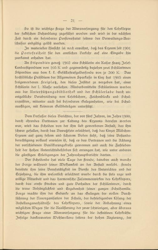 Dem Verfasser dieses Berichtes, der vor fünf Jahren, im Jahre ^900, durch ehrendes vertrauen zur Leitung des Lyzeums berufen worden war, wird das Scheiden von der ihm lieb gewordenen Anstalt, das ihm schwer gefallen, durch das Bewußtsein erleichtert, daß das Linzer Mädchen- Lyzeum auf ganz festem und sicherem Boden steht, daß seine Bestandsberechtigung vollauf erwiesen ist, daß es das Vertrauen und die Achtung der verschiedenen Bevölkerungskreise gewonnen und auch die Zufriedenheit der hohen Unterrichtsbehörden sich errungen hat, wie unter anderen die günstigen Erledigungen der Iahreshauptberichte dartun.