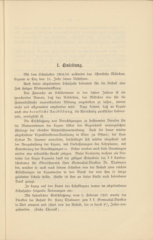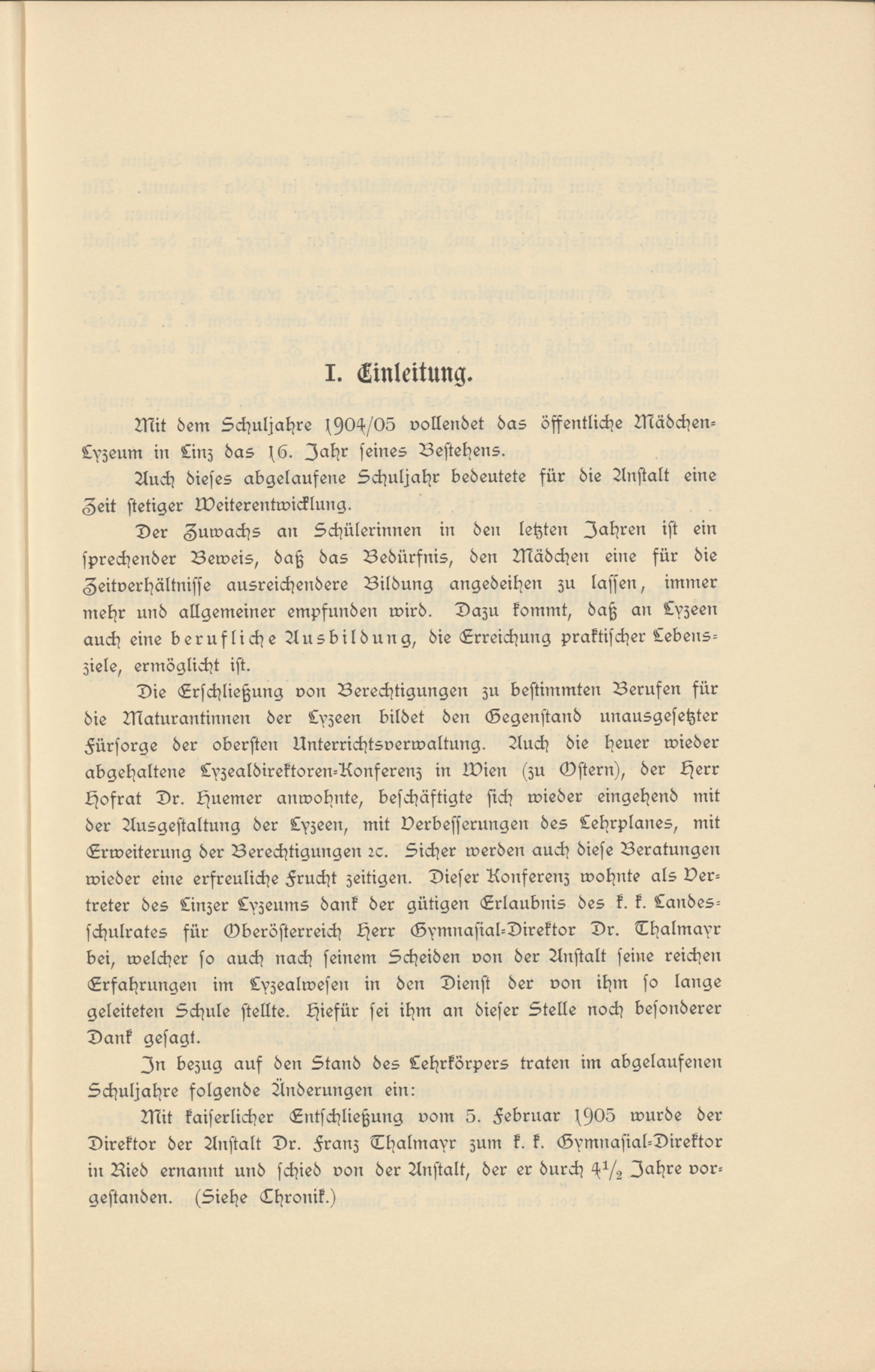 Die Erschließung von Berechtigungen zu bestimmten Berufen für die Maturantinnen der Lyzeen bildet den Gegenstand unausgesetzter Fürsorge der obersten Unterrichtsverwaltung. Auch die Heuer wieder abgehaltene Lyzealdirektoren-Aonferenz in Mien (zu Mstern), der Herr Hofrat Dr. Huemer anwohnte, beschäftigte sich wieder eingehend mit der Ausgestaltung der Lyzeen, mit Verbesserungen des Lehrplanes, mit Erweiterung der Berechtigungen rc. Sicher werden auch diese Beratungen wieder eine erfreuliche Frucht zeitigen. Dieser Aonferenz wohnte als Vertreter des Linzer Lyzeums dank der gütigen Erlaubnis des k. k. Landes- schulrates für Gberösterreich Herr Gymnasial-Direktor Dr. Thalmayr bei, welcher so auch nach seinem Scheiden von der Anstalt seine reichen Erfahrungen im Lyzealwesen in den Dienst der von ihm so lange geleiteten Schule stellte. Hiefür sei ihm an dieser Stelle noch besonderer Dank gesagt.
