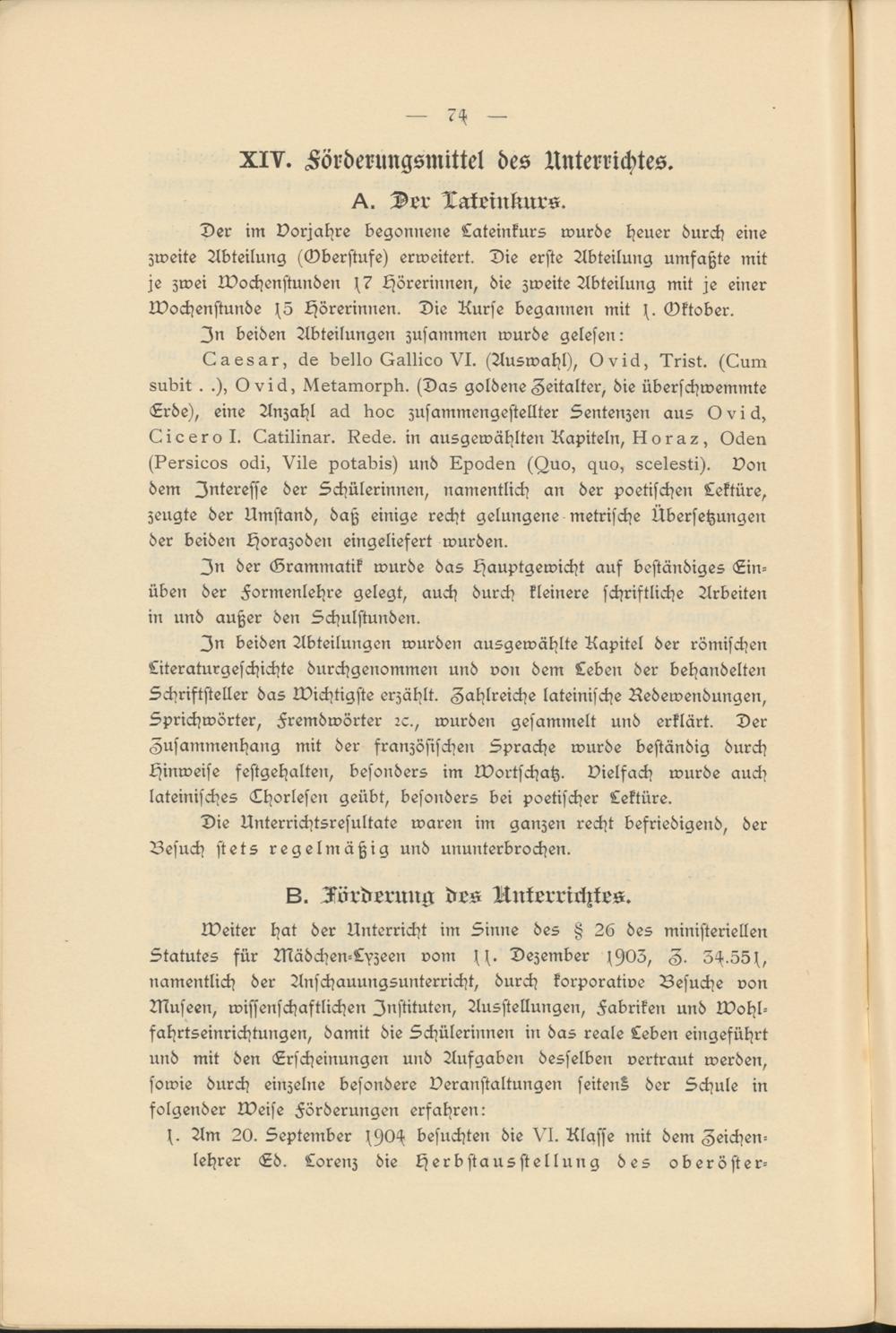 Der im Vorjahre begonnene Lateinkurs wurde Heuer durch eine zweite Abteilung (Oberstufe) erweitert. Die erste Abteilung umfaßte mit je zwei wochenstunden s? Hörerinnen, die zweite Abteilung mit je einer wochenstunde 1(3 Hörerinnen. Die Kurse begannen mit H Oktober.