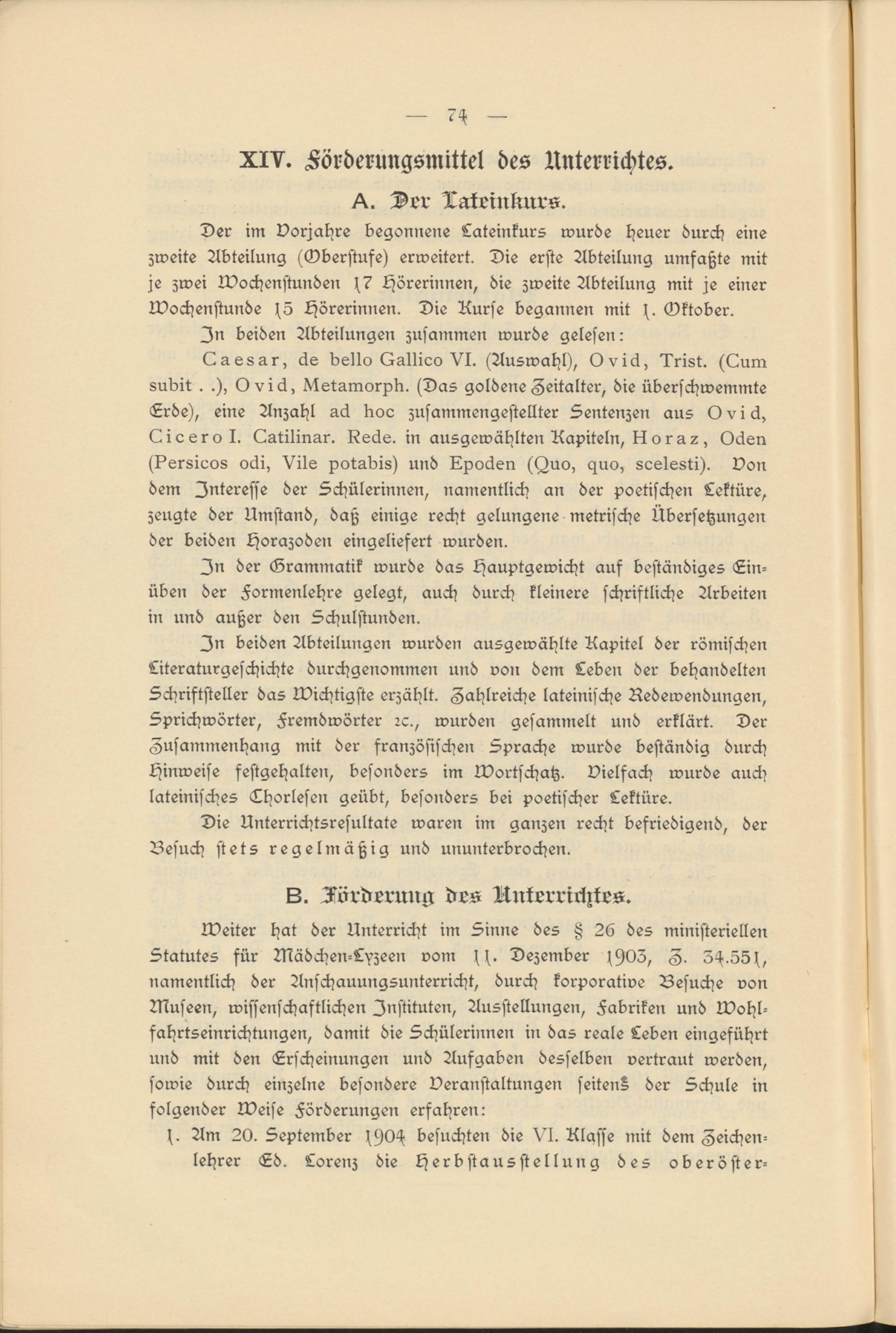 In beiden Abteilungen wurden ausgewählte Kapitel der römischen Literaturgeschichte durchgenommen und von dem Leben der behandelten Schriftsteller das wichtigste erzählt. Zahlreiche lateinische Redewendungen, Sprichwörter, Fremdwörter rc., wurden gesammelt und erklärt. Der Zusammenhang mit der französischen Sprache wurde beständig durch Hinweise festgehalten, besonders im Wortschatz, vielfach wurde auch lateinisches Ehorlesen geübt, besonders bei poetischer Lektüre.