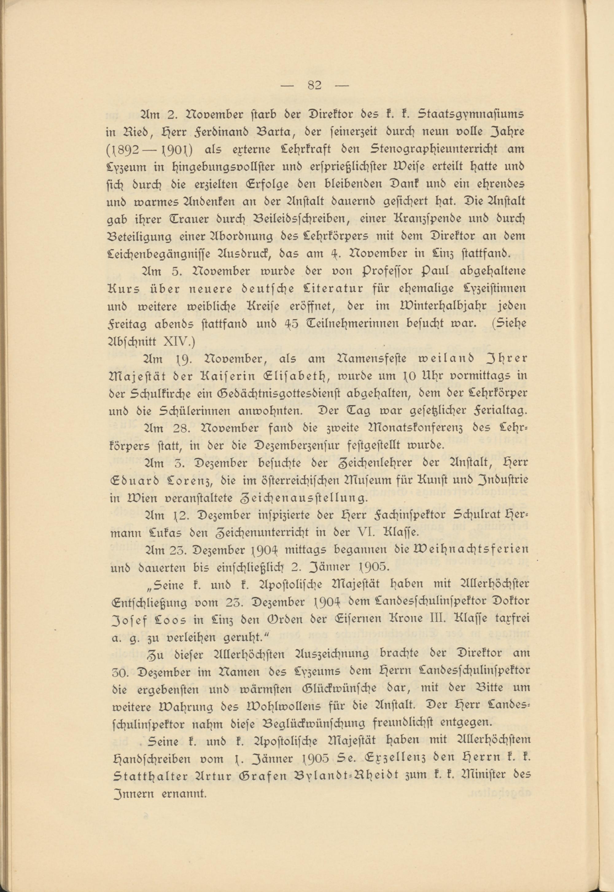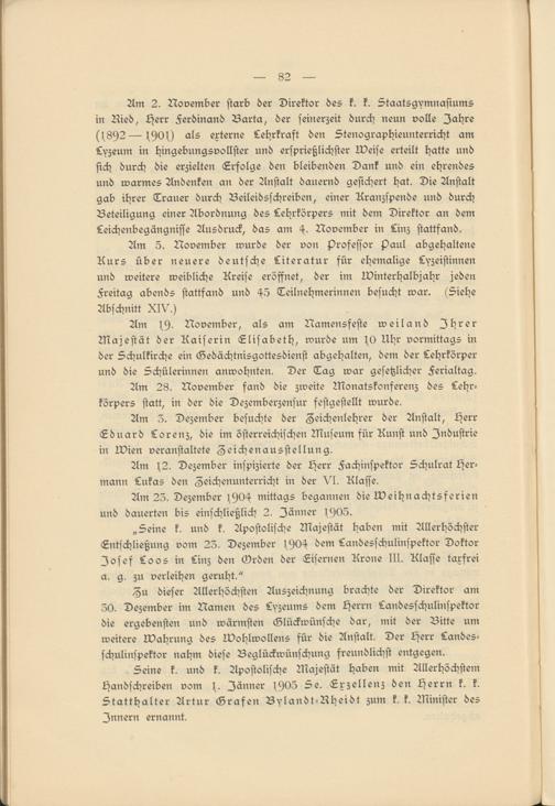 Am 2. November starb der Direktor des k. k. Staatsgymnasiums in Ried, Herr Ferdinand Barta, der seinerzeit durch neun volle Jahre (s892—^900 als externe Lehrkraft den Stenographieunterricht am Lyzeum in hingebungsvollster und ersprießlichster weise erteilt hatte und sich durch die erzielten Erfolge den bleibenden Dank und ein ehrendes und warmes Andenken an der Anstalt dauernd gesichert hat. Die Anstalt gab ihrer Trauer durch Beileidsschreiben, einer Kranzspende und durch Beteiligung einer Abordnung des Lehrkörpers mit dem Direktor an dem Leichenbegängnisse Ausdruck, das am H. November in Linz stattfand.
