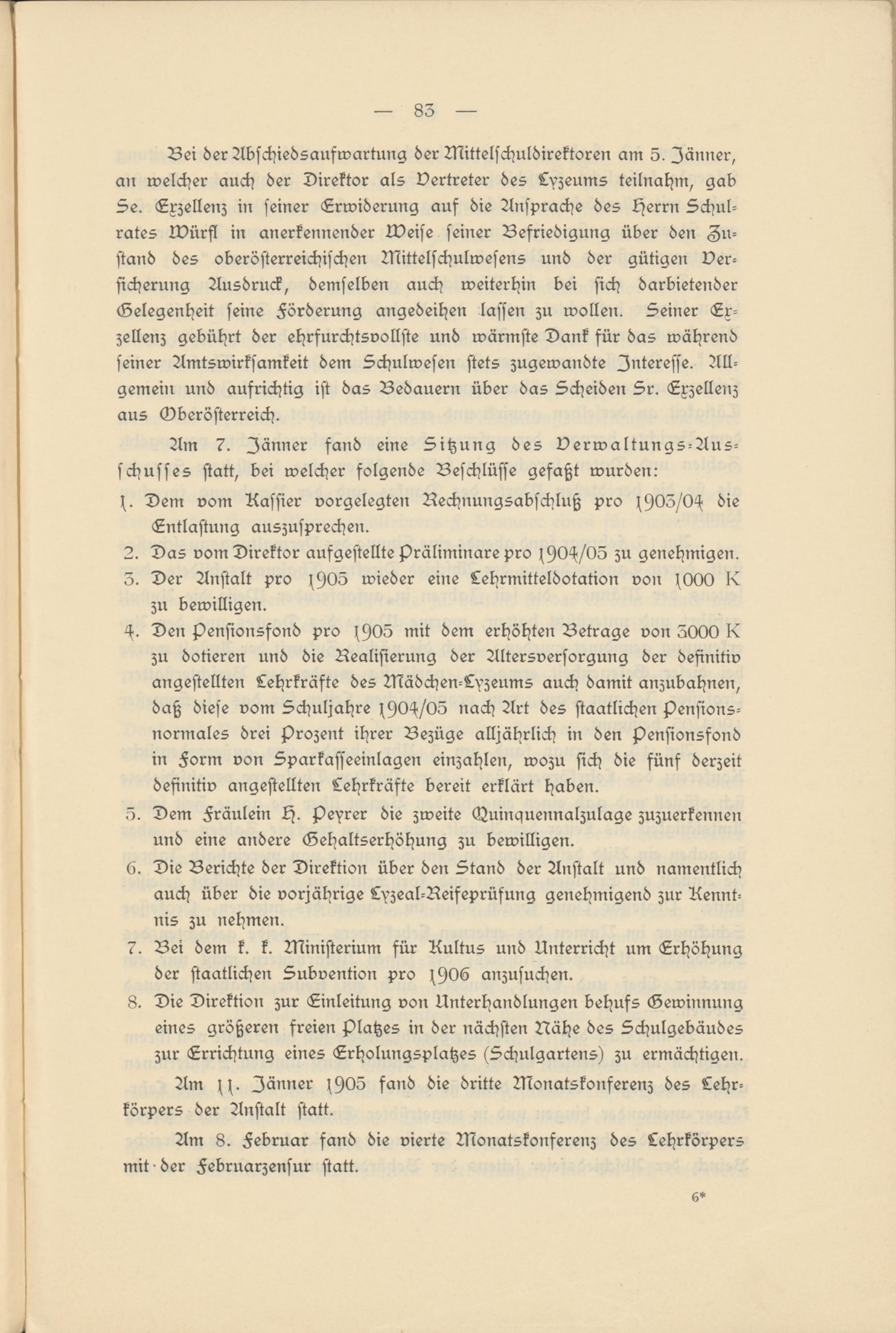 Den Pensionsfond pro ss)05 mit dem erhöhten Betrage von 5000 X zu dotieren und die Realisierung der Altersversorgung der definitiv angestellten Lehrkräfte des Mädchen-Lyzeums auch damit anzubahnen, daß diese vom Schuljahre s90H/05 nach Art des staatlichen pensions- normales drei Prozent ihrer Bezüge alljährlich in den pensionssond in Form von Sparkasseeinlagen einzahlen, wozu sich die fünf derzeit definitiv angestellten Lehrkräfte bereit erklärt haben.