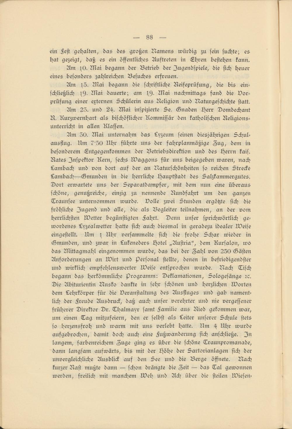 Am 50. Mai unternahm das Lyzeum seinen diesjährigen Schul- ausflug. Um 7 50 Uhr führte uns der fahrplanmäßige Zug, dem in besonderem Entgegenkommen der Betriebsdirektion und des Herrn kais. Rates Inspektor Kern, sechs Waggons für uns beigegeben waren, nach Lambach und von dort auf der an Naturschönheiten so reichen Strecke Lambach—Gmunden in die herrliche Hauptstadt des Salzkammergutes. Dort erwartete uns der Separatdampfer, mit dem nun eine überaus schöne, genußreiche, einzig zu nennende Rundfahrt um den ganzen Traunsee unternommen wurde. Volle zwei Stunden ergötzte sich die fröhliche Jugend und alle, die als Begleiter teilnahmen, an der vom herrlichsten Wetter begünstigten Fahrt. Denn unser sprichwörtlich gewordenes Lyzealwetter hatte sich auch diesmal in geradezu idealer weise eingestellt. Um ^ Uhr versammelte sich die frohe Schar wieder in Gmunden, und zwar in Lukeneders Hotel „Austria", dem Kursalon, wo das Mittagmahl eingenommen wurde, das bei der Zahl von 250 Gästen Anforderungen an Wirt und personal stellte, denen in befriedigendster und wirklich empfehlenswerter weise entsprochen wurde. Nach Tisch begann das herkömmliche Programm: Deklamationen, Sologesänge rc. Die Abiturientin Nusko dankte in sehr schönen und herzlichen Worten dem Lehrkörper für die Veranstaltung des Ausfluges und gab namentlich der Freude Ausdruck, daß auch unser verehrter und nie vergessener früherer Direktor Dr. Thalmavr samt Familie aus Ried gekommen war, um einen Tag mitzufeiern, den er selbst als Leiter unserer Schule stets so herzensfroh und warm mit uns verlebt hatte. Um H Uhr wurde aufgebrochen, damit doch auch eine Fußwanderung sich anschließe. In langem, farbenreichem Zuge ging es über die schöne Traunpromanade, dann langsam aufwärts, bis mit der Höhe der Sartorianlagen sich der unvergleichliche Ausblick auf den See und die Berge öffnete. Nach kurzer Rast mußte dann — schon drängte die Zeit — das Tal gewonnen werden, freilich mit manchem weh und Ach über die steilen wiesen-