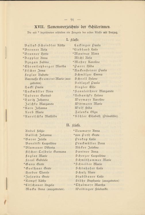 Andel Felizie Ballich Johanna *Bayer Iosefa Benedikt Leopoldine ^Blumauer Viktoria Fischer-Lolbrie Germana Foglar Marie Fresl Gabriele *Gans Grete *Geelhaar Grete Gerber Therese *Iesovits Grete *Rempf Räthe *Li tschau er Angela Macku Anna (ausgetreten).