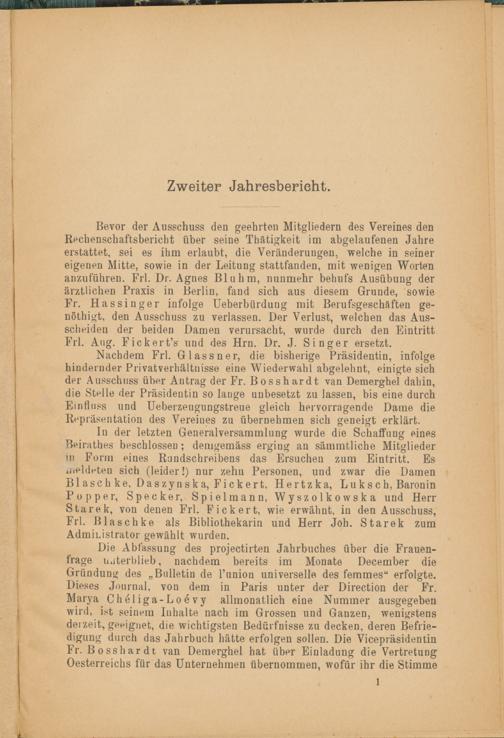 Die Abfassung des projectirten Jahrbuches über die Frauenfrage unterblieb, nachdem bereits im Monate December die Gründung des „Bulletin de l’union universelle des femmes“ erfolgte. Dieses Journal, von dem in Paris unter der Direction der Fr. Marya Cheliga-Loevy allmonatlich eine Nummer ausgegeben wird, ist seinem Iuhalte nach im Grossen und Ganzen, wenigstens derzeit, geeignet, die wichtigsten Bedürfnisse zu decken, deren Befriedigung durch das Jahrbuch hätte erfolgen sollen. Die Vicepräsidentin Fr. Bo ss har dt van Demerghel hat über Einladung die Vertretung Oesterreichs für das Unternehmen übernommen, wofür ihr die Stimme