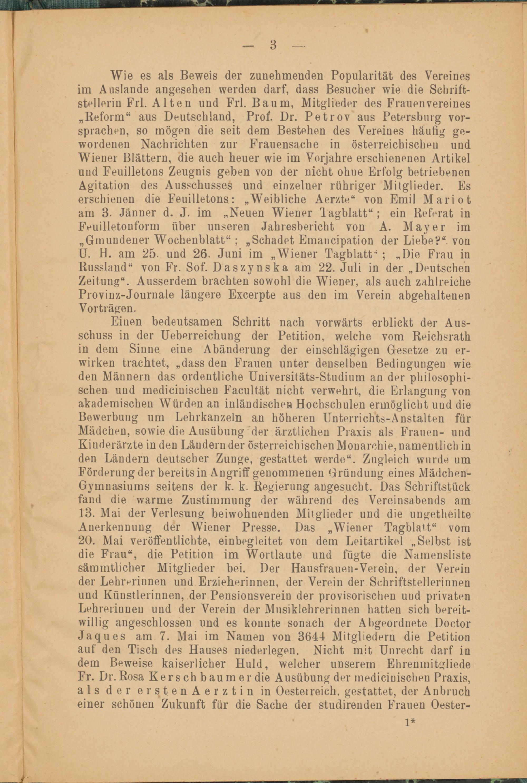 Einen bedeutsamen Schritt nach vorwärts erblickt der Ausschuss in der Ueberreichung der Petition, welche vom Reichsrath in dem Sinne eine Abänderung der einschlägigen Gesetze zu erwirken trachtet, „dass den Frauen unter denselben Bedingungen wie den Männern das ordentliche Universitäts-Studium an der philosophischen und medicinischen Facultät nicht verwehrt, die Erlangung von akademischen Würden an inländischen Hochschulen ermöglicht uud die Bewerbung um Lehrkanzeln an höheren Unterrichts-Anstalten für Mädchen, sowie die Ausübung’der ärztlichen Praxis als Frauen- und Kinderärzte in den Ländernder österreichischen Monarchie, namentlich in den Ländern deutscher Zunge, gestattet werde“. Zugleich wurde um Förderung der bereits in Angriff genommenen Gründung eines Mädchen- Gymnasiums seitens der k. k. Regierung angesucht. Das Schriftstück fand die warme Zustimmung der während des Vereinsabends am 13. Mai der Verlesung beiwohnenden Mitglieder und die ungetheilte Anerkennung der Wiener Presse. Das „Wiener Tagblat.t“ vom 20. Mai veröffentlichte, einbegleitet von dem Leitartikel „Selbst ist die Frau“, die Petition im Wortlaute und fügte die Namensliste sämmtlicher Mitglieder bei. Der Hausfrauen-Verein, der Verein der Lehrerinnen und Erzieherinnen, der Verein der Schriftstellerinnen und Künstlerinnen, der Pensionsverein der provisorischen uud privaten Lehrerinnen und der Verein der Musiklehrerinnen hatten sich bereitwillig angeschlossen und es konnte sonach der Abgeordnete Doctor Jaques am 7. Mai im Namen von 3644 Mitgliedern die Petition auf den Tisch des Hauses niederlegen. Nicht mit Unrecht darf in dem Beweise kaiserlicher Huld, welcher unserem Ehrenmitgliede Fr. Dr. Rosa Kersch bäum er die Ausübung der medicinischen Praxis, als der erst.enAerztin in Oesterreich, gestattet, der Anbruch einer schönen Zukunft für die Sache der studirenden Frauen Oester-