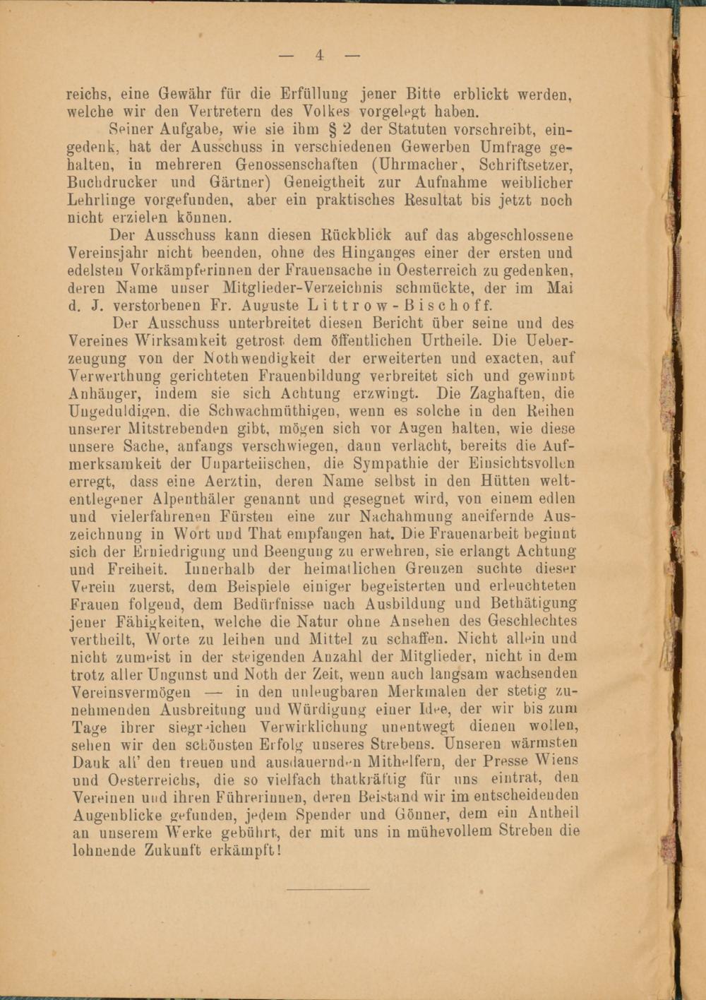 Der Ausschuss kann diesen Rückblick auf das abgeschlossene Vereinsjahr nicht beenden, ohne des Hinganges einer der ersten und edelsten Vorkämpferinnen der Frauensache in Oesterreich zu gedenken, deren Name unser Mitglieder-Verzeichnis schmückte, der im Mai d. J. verstorbenen Fr. Auguste Littrow-Bischoff.
