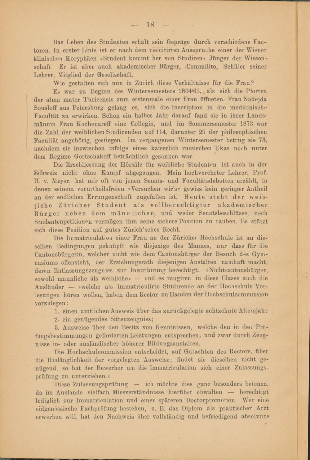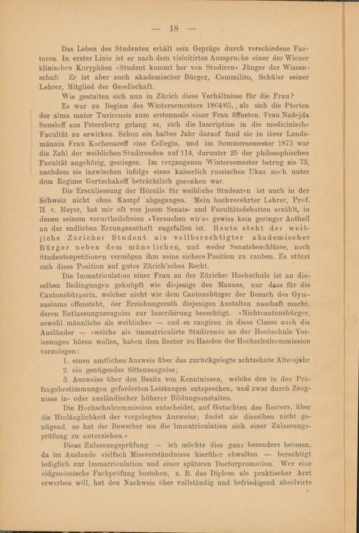 Die Erschliessung der Hörsäle für weibliche Studenten ist auch in der Schweiz nicht ohne Kampf abgegangen. Mein hochverehrter Lehrer, Prof. H. v. Meyer, hat mir oft von jenen Senats- und Facultätsdebatten erzählt, in denen seinem vorurtheilsfreien »Versuchen wir’s« gewiss kein geringer Antheil an der endlichen Errungenschaft zugefallen ist. Heute steht der weibliche Züricher Student als vollberechtigter akademischer Bürger neben dem männ liehen, und weder Senatsbeschlüsse, noch Studentenpetitionen vermögen ihm seine sichere Position zu rauben. Es stützt sich diese Position auf gutes Zürich’sches Recht.