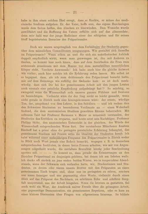 Doch wir waren ursprünglioh von dem Verhältniss der Studentin gegenüber dem männlichen Commilitonen ausgegangen. Wie gestaltet sich dasselbe im Präparirsaale ? Wenn schon an und für sich ein unästhetischer Anblick doppelt empfindlich wirkt, wenn man gezwungen ist, ihn mit Anderen zu theilen, so kommt hier noch hinzu, dass auf dem Secirboden die Frau zum erstenmale gemeinsam mit dem Manne vor dem unverhüllten menschlichen Körper steht. Verehrte Anwesende! Ich habe auch hier die gleiche Antwort wie vorher; auch hier möchte ich die Erfahrung reden lassen. Mir selbst ist es begegnet, dass, als ich zum drittenmale den Präparirsaal besucht hatte, mir auf dem Heimwege wie zufällig der Gedanke kam: es ist doch merkwürdig, dass sich Dir bei der gemeinsamen Arbeit mit den jungen Leuten noch niemals eine peinliche Empfindung aufgedrängt hat!? So mächtig, so zwingend weiss die Wissenschaft sich unseres ganzen Fühlens und Denkens zu bemächtigen. Vielleicht wäre ihr der Sieg nicht so leicht gemacht, wenn nicht gerade in Zürich noch eins hinzugekommen wäre: der ernste, würdige Ton, der, ausgehend von dem Lehrer, in den Schülern — und ich rechne dies den Schweizer Studenten zu besonderem Verdienste an — einen Widerhall findend, die dem anatomischen Studium geweihten Räume beherrschte. Mit seltenem Takt hat Professor Hermann v. Meyer es seinerzeit verstanden, der Studentin das Erröthen zu ersparen, und heute setzt sein Nachfolger, Professor Philipp Stöhr, den anatomischen Unterricht in der gleichen, der Würde der Wissenschaft entsprechenden Weise fort. Der verstorbene Münchener Anatom Bischoff hat a priori ohne die geringste persönliche Erfahrung behauptet, das gemeinsame Studium mit Frauen setze die Idealität der Studenten herab. Ich habe während einer mehrjährigen Frequenz des Präparirsaales in Zürich weder in Blick noch Wort jemals eine Roheit bemerkt, wogegen z. B. in deutschen entsprechenden Instituten, in denen keine Frauen arbeiten, wie mir von Augenzeugen mitgetheilt wurde, die entfaltete Brutalität häufig jeder Beschreibung