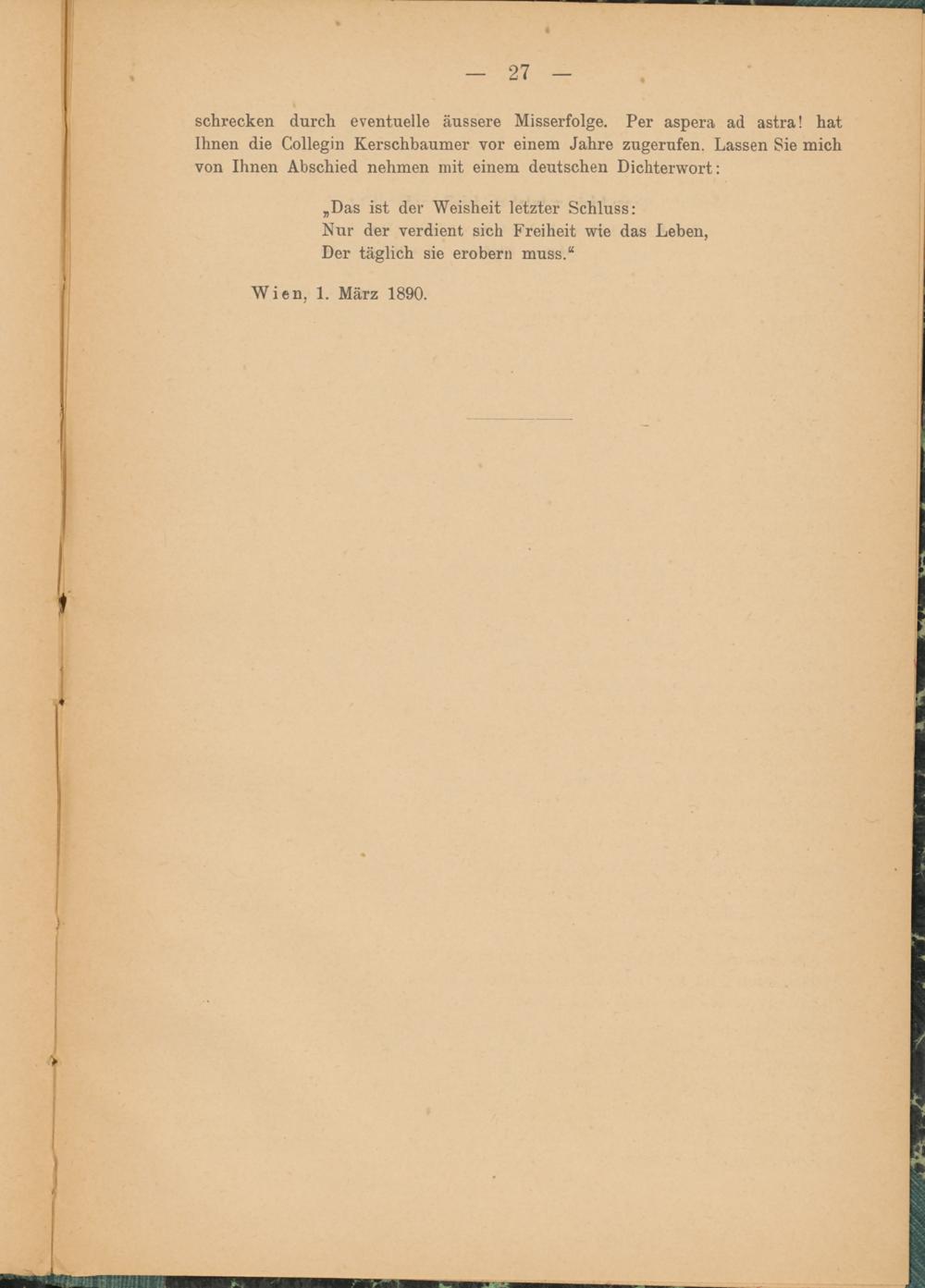 schrecken durch eventuelle äussere Misserfolge. Per aspera ad astra! hat Ihnen die Collegin Kerschbaumer vor einem Jahre zugerufen. Lassen Sie mich von Ihnen Abschied nehmen mit einem deutschen Dichterwort: