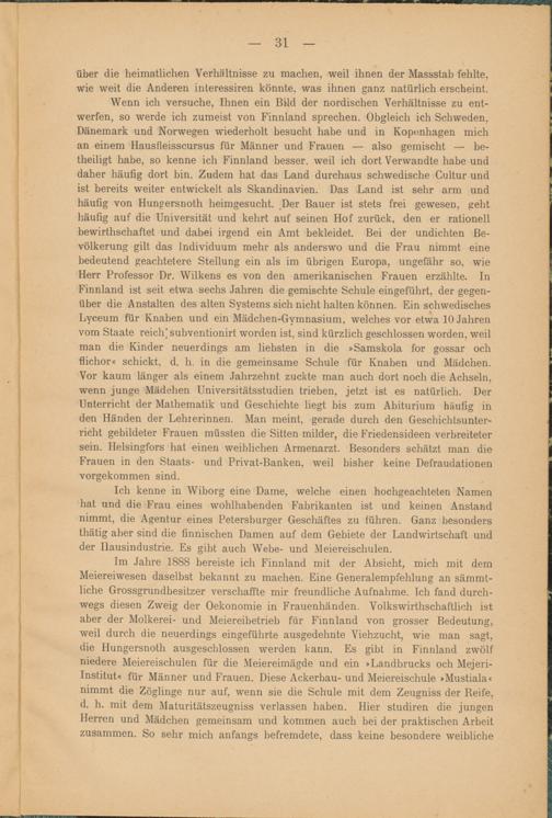 Ich kenne in Wiborg eine Dame, welche einen hochgeachteten Namen hat und die Frau eines wohlhabenden Fabrikanten ist und keinen Anstand nimmt, die Agentur eines Petersburger Geschäftes zu führen. Ganz besonders thätig aber sind die finnischen Damen auf dem Gebiete der Landwirtschaft und der Hausindustrie. Es gibt auch Webe- und Meiereischulen.