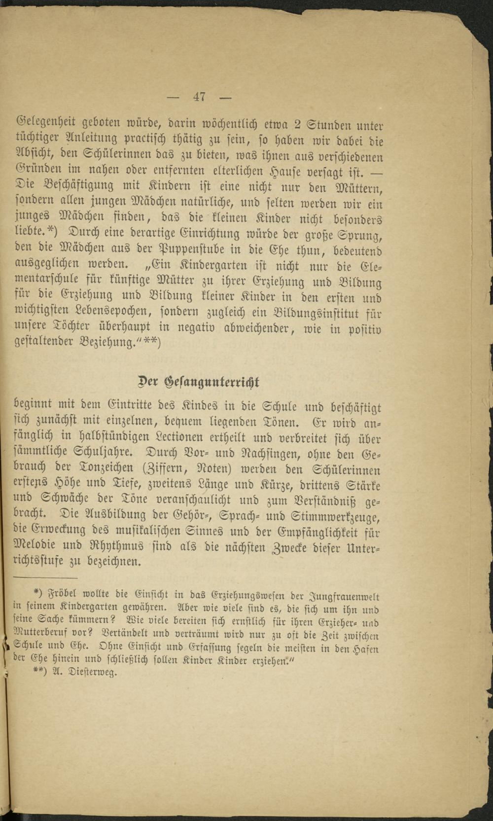beginnt mit dem Eintritte des Kindes in die Schule und beschäftigt sich zunächst mit einzelnen, bequem liegenden Tönen. Er wird anfänglich in halbstündigen Lectionen ertheilt und verbreitet sich über sämmtliche Schuljahre. Durch Vor- und Nachsingen, ohne den Gebrauch der Tonzeichen (Ziffern, Noten) werden den Schülerinnen erstens Höhe und Tiefe, zweitens Länge und Kürze, drittens Stärke und Schwäche der Töne veranschaulicht und zum Verständniß gebracht. Die Ausbildung der Gehör-, Sprach- und Stimmwerkzeuge, die Erweckung des musikalischen Sinnes und der Empfänglichkeit für Melodie und Rhythmus sind als die nächsten Zwecke dieser Unterrichtsstufe zu bezeichnen.