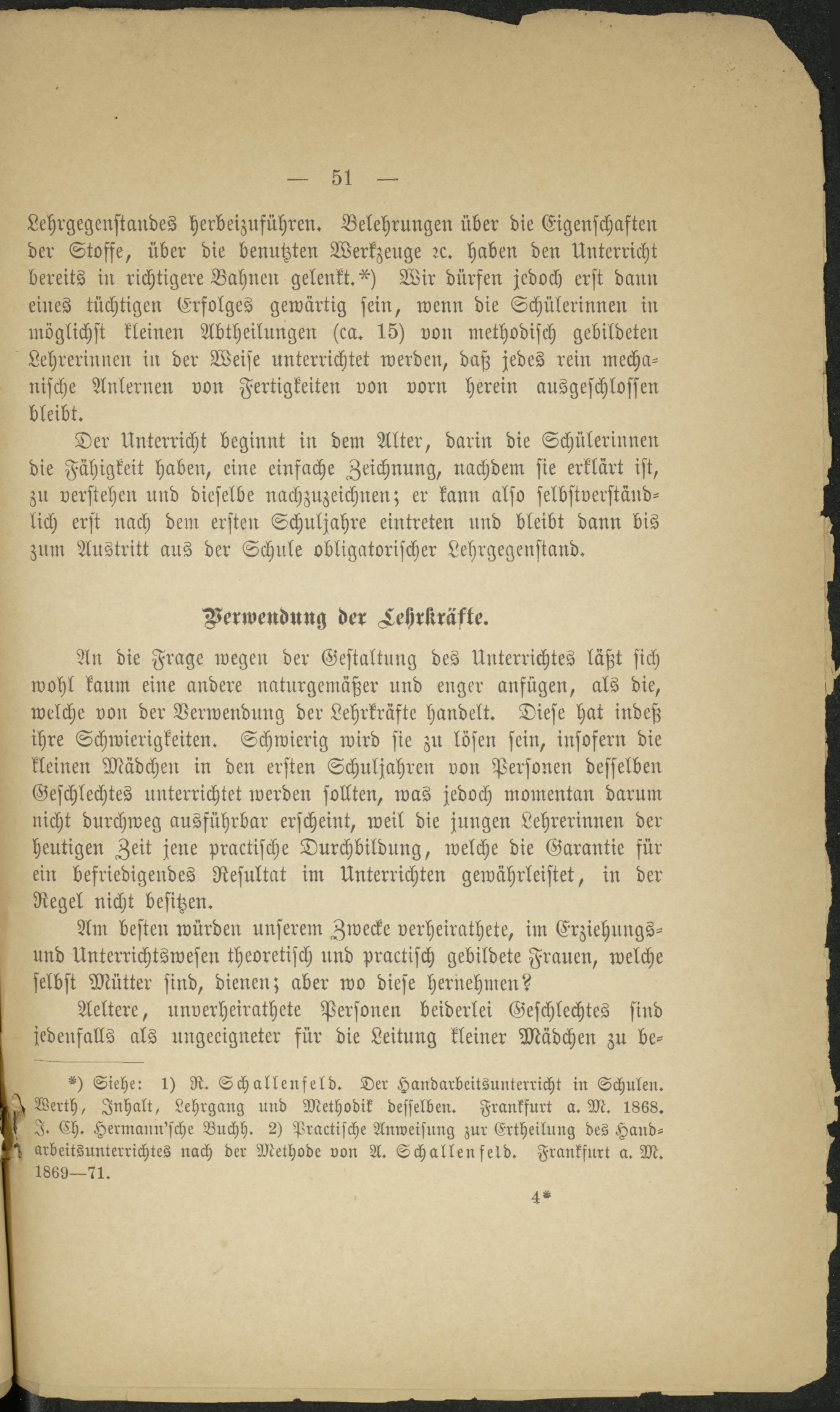 *) Siehe: 1) R. Schallenfeld. Der Handarbeitsunterricht in Schulen. Werth, Inhalt, Lehrgang und Methodik desselben. Frankfurt a. M. 1868. l I. Ch. Hermann'sche Buchh. 2) Practische Anweisung zur Ertheilung des Hand- ^ arbeitsunterrichtes nach der Methode von A. Schallenfeld. Frankfurt a. M. 1869—71.