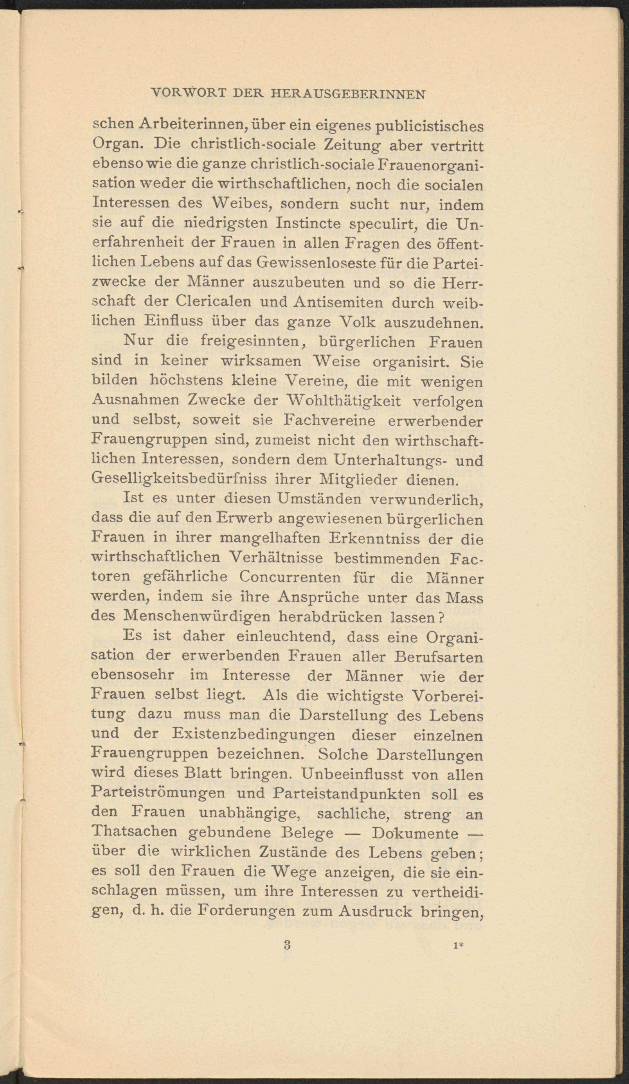 sehen Arbeiterinnen, über ein eigenes publicistisches Organ. Die christlich-sociale Zeitung aber vertritt ebenso wie die ganze christlich-sociale Frauenorganisation weder die wirtschaftlichen, noch die socialen Interessen des Weibes, sondern sucht nur, indem sie auf die niedrigsten Instincte speculirt, die Unerfahrenheit der Frauen in allen Fragen des öffentlichen Lebens auf das Gewissenloseste für die Parteizwecke der Männer auszubeuten und so die Herrschaft der Clericalen und Antisemiten durch weiblichen Einfluss über das ganze Volk auszudehnen.