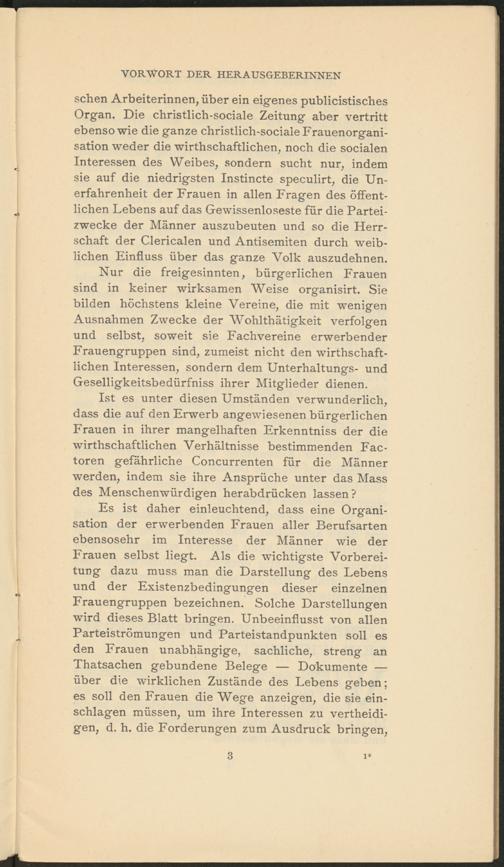 Es ist daher einleuchtend, dass eine Organisation der erwerbenden Frauen aller Berufsarten ebensosehr im Interesse der Männer wie der Frauen selbst liegt. Als die wichtigste Vorbereitung dazu muss man die Darstellung des Lebens und der Existenzbedingungen dieser einzelnen Frauengruppen bezeichnen. Solche Darstellungen wird dieses Blatt bringen. Unbeeinflusst von allen Parteiströmungen und Parteistandpunkten soll es den Frauen unabhängige, sachliche, streng an Thatsachen gebundene Belege — Dokumente — über die wirklichen Zustände des Lebens geben; es soll den Frauen die Wege anzeigen, die sie ein- schlagen müssen, um ihre Interessen zu vertheidi- gen, d. h. die Forderungen zum Ausdruck bringen,