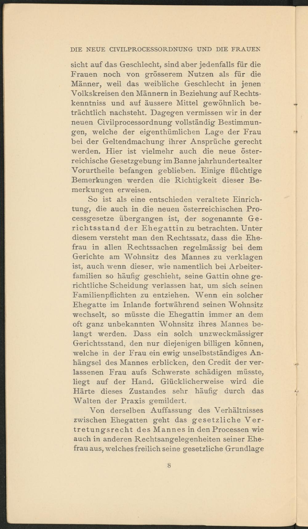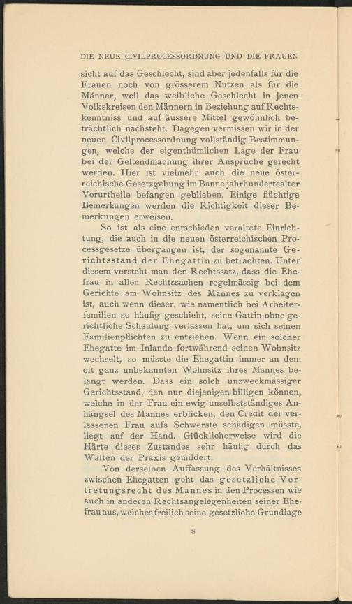 sicht auf das Geschlecht, sind aber jedenfalls für die Frauen noch von grösserem Nutzen als für die Männer, weil das weibliche Geschlecht in jenen Volkskreisen den Männern in Beziehung auf Rechts- kenntniss und auf äussere Mittel gewöhnlich beträchtlich nachsteht. Dagegen vermissen wir in der neuen Civilprocessordnung vollständig Bestimmungen, welche der eigenthümlichen Lage der Frau bei der Geltendmachung ihrer Ansprüche gerecht werden. Hier ist vielmehr auch die neue österreichische Gesetzgebung im Banne jahrhundertealter Vorurtheile befangen geblieben. Einige flüchtige Bemerkungen werden die Richtigkeit dieser Bemerkungen erweisen.