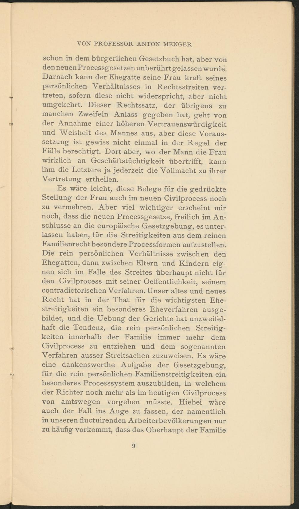 Es wäre leicht, diese Belege für die gedrückte Stellung der Frau auch im neuen Civilprocess noch zu vermehren. Aber viel wichtiger erscheint mir noch, dass die neuen Processgesetze, freilich im Anschlüsse an die europäische Gesetzgebung, es unterlassen haben, für die Streitigkeiten aus dem reinen Familienrecht besondere Processformen aufzustellen. Die rein persönlichen Verhältnisse zwischen den Ehegatten, dann zwischen Eltern und Kindern eignen sich im Falle des Streites überhaupt nicht für den Civilprocess mit seiner Oeffentlichkeit, seinem contradictorischen Verfahren. Unser altes und neues Recht hat in der That für die wichtigsten Ehestreitigkeiten ein besonderes Eheverfahren ausgebildet, und die Uebung der Gerichte hat unzweifelhaft die Tendenz, die rein persönlichen Streitigkeiten innerhalb der Familie immer mehr dem Civilprocess zu entziehen und dem sogenannten Verfahren ausser Streitsachen zuzuweisen. Es wäre eine dankenswerthe Aufgabe der Gesetzgebung, für die rein persönlichen Familienstreitigkeiten ein besonderes Processsystem auszubilden, in welchem der Richter noch mehr als im heutigen Civilprocess von amtswegen Vorgehen müsste. Hiebei wäre auch der Fall ins Auge zu fassen, der namentlich in unseren fluctuirenden Arbeiterbevölkerungen nur zu häufig vorkommt, dass das Oberhaupt der Familie