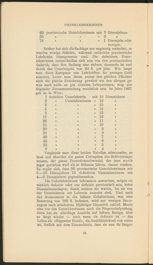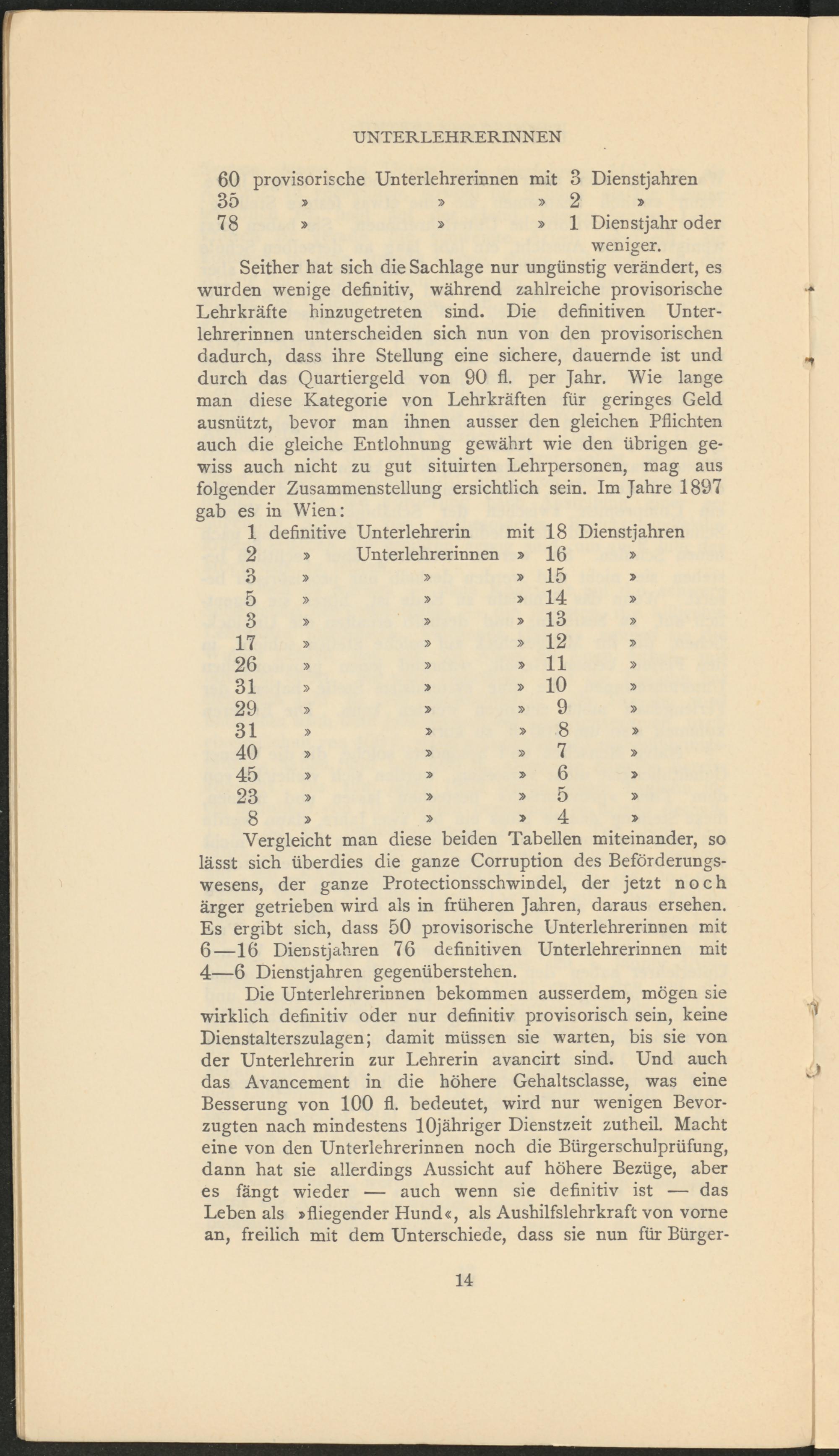 Seither hat sich die Sachlage nur ungünstig verändert, es wurden wenige definitiv, während zahlreiche provisorische Lehrkräfte hinzugetreten sind. Die definitiven Unterlehrerinnen unterscheiden sich nun von den provisorischen dadurch, dass ihre Stellung eine sichere, dauernde ist und durch das Quartiergeld von 90 fl. per Jahr. Wie lange man diese Kategorie von Lehrkräften für geringes Geld ausnützt, bevor man ihnen ausser den gleichen Pflichten auch die gleiche Entlohnung gewährt wie den übrigen gewiss auch nicht zu gut situirten Lehrpersonen, mag aus folgender Zusammenstellung ersichtlich sein. Im Jahre 1897 gab es in Wien: