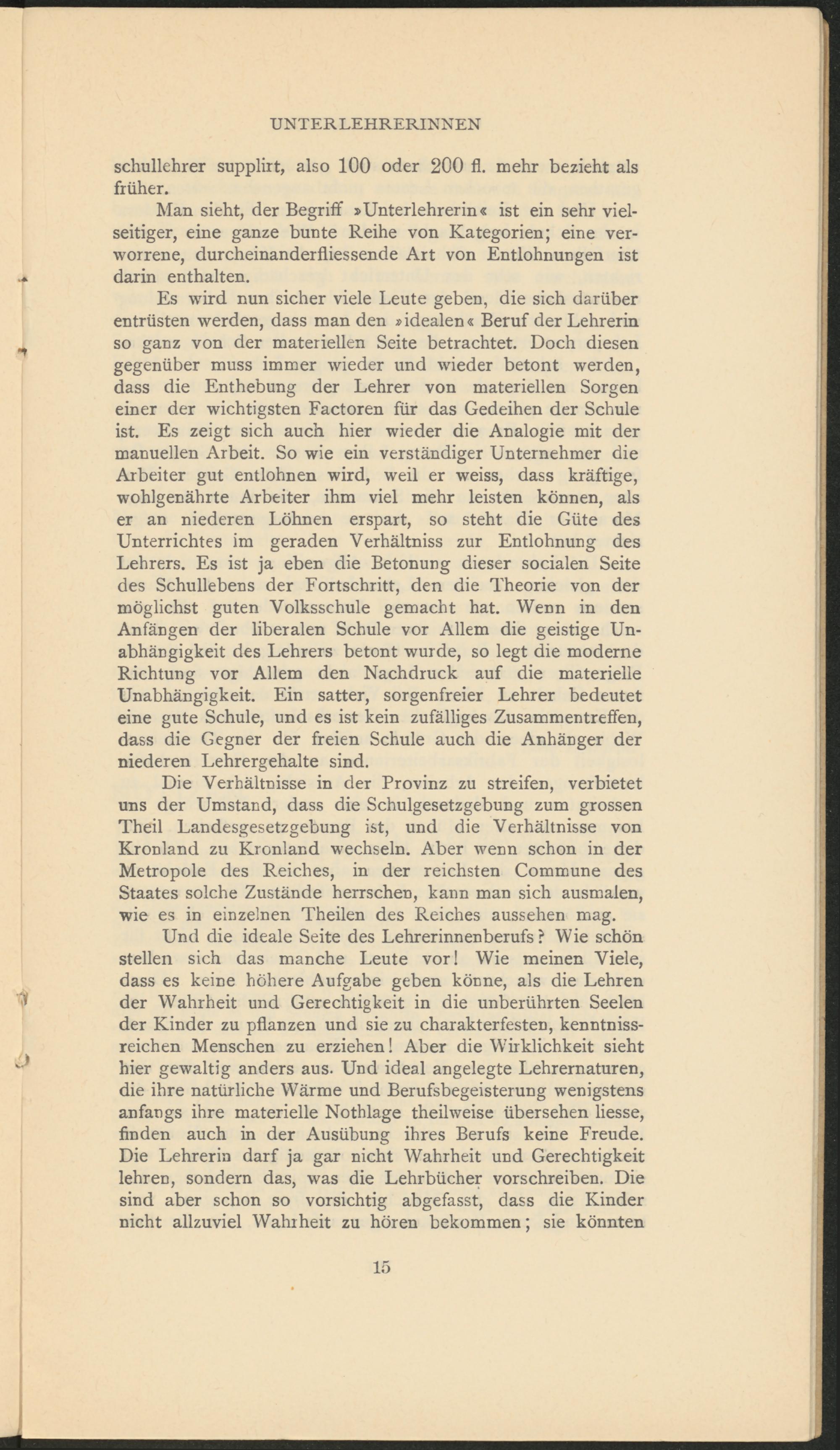 Es wird nun sicher viele Leute geben, die sich darüber entrüsten werden, dass man den »idealen« Beruf der Lehrerin so ganz von der materiellen Seite betrachtet. Doch diesen gegenüber muss immer wieder und wieder betont werden, dass die Enthebung der Lehrer von materiellen Sorgen einer der wichtigsten Factoren für das Gedeihen der Schule ist. Es zeigt sich auch hier wieder die Analogie mit der manuellen Arbeit. So wie ein verständiger Unternehmer die Arbeiter gut entlohnen wird, weil er weiss, dass kräftige, wohlgenährte Arbeiter ihm viel mehr leisten können, als er an niederen Löhnen erspart, so steht die Güte des Unterrichtes im geraden Verhältniss zur Entlohnung des Lehrers. Es ist ja eben die Betonung dieser socialen Seite des Schullebens der Fortschritt, den die Theorie von der möglichst guten Volksschule gemacht hat. Wenn in den Anfängen der liberalen Schule vor Allem die geistige Unabhängigkeit des Lehrers betont wurde, so legt die moderne Richtung vor Allem den Nachdruck auf die materielle Unabhängigkeit. Ein satter, sorgenfreier Lehrer bedeutet eine gute Schule, und es ist kein zufälliges Zusammentreffen, dass die Gegner der freien Schule auch die Anhänger der niederen Lehrergehalte sind.