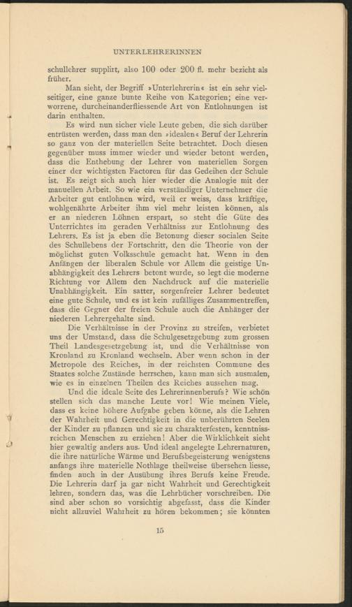 Und die ideale Seite des Lehrerinnenberufs? Wie schön stellen sich das manche Leute vorl Wie meinen Viele, dass es keine höhere Aufgabe geben könne, als die Lehren der Wahrheit und Gerechtigkeit in die unberührten Seelen der Kinder zu pflanzen und sie zu charakterfesten, kenntnisreichen Menschen zu erziehen! Aber die Wirklichkeit sieht hier gewaltig anders aus. Und ideal angelegte Lehrernaturen, die ihre natürliche Wärme und Berufsbegeisterung wenigstens anfangs ihre materielle Nothlage theilweise übersehen liesse, finden auch in der Ausübung ihres Berufs keine Freude. Die Lehrerin darf ja gar nicht Wahrheit und Gerechtigkeit lehren, sondern das, was die Lehrbücher vorschreiben. Die sind aber schon so vorsichtig abgefasst, dass die Kinder nicht allzuviel Wahrheit zu hören bekommen; sie könnten