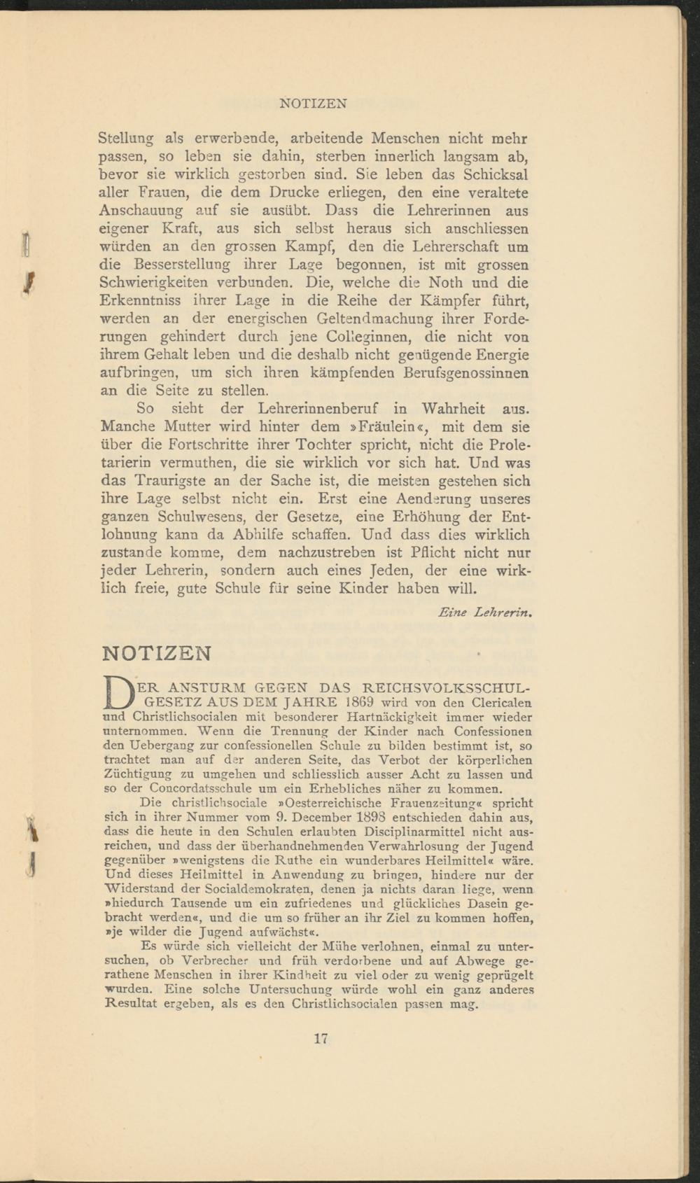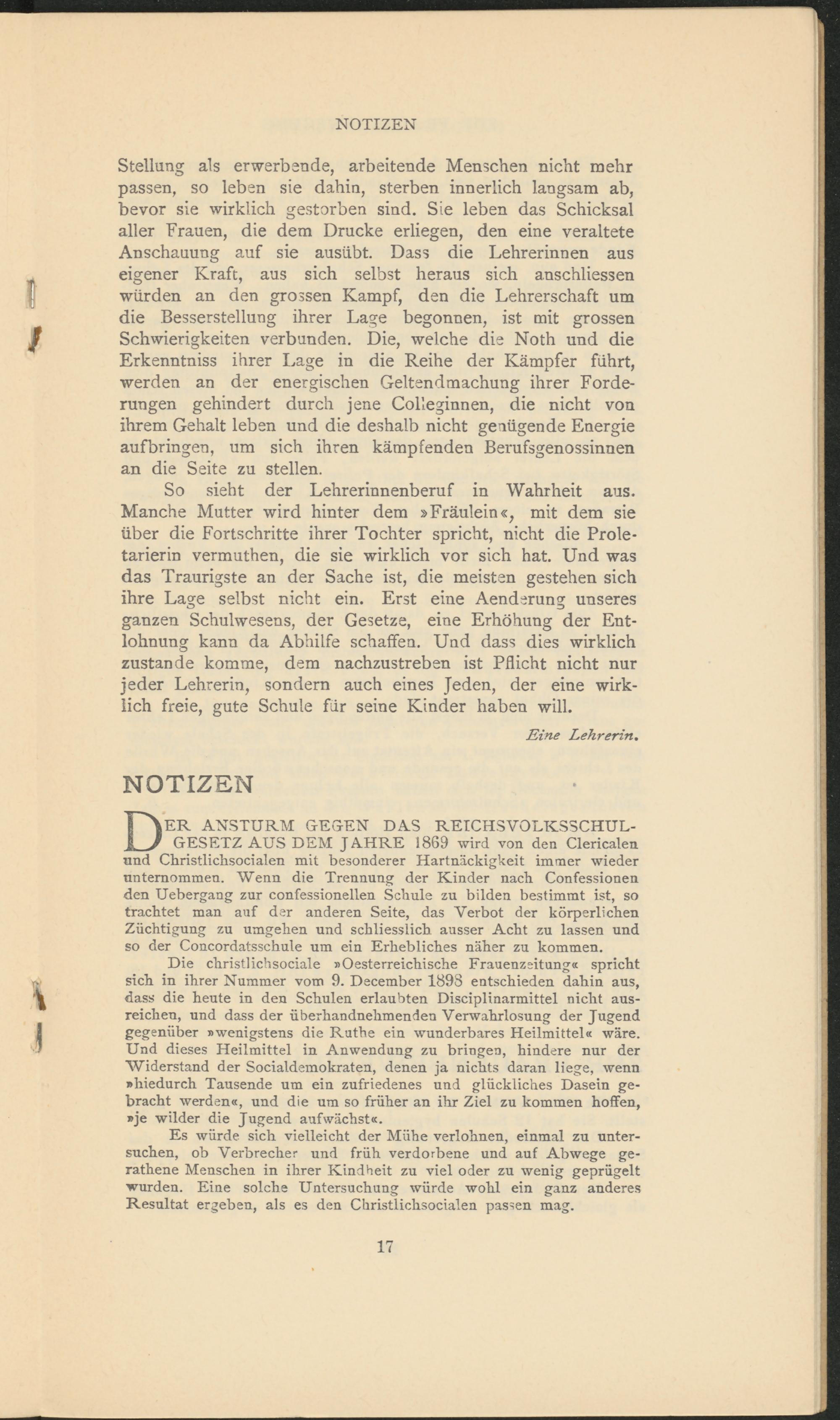 So sieht der Lehrerinnenberuf in Wahrheit aus. Manche Mutter wird hinter dem »Fräulein«, mit dem sie über die Fortschritte ihrer Tochter spricht, nicht die Proletarierin vermuthen, die sie wirklich vor sich hat. Und was das Traurigste an der Sache ist, die meisten gestehen sich ihre Lage selbst nicht ein. Erst eine Aenderung unseres ganzen Schulwesens, der Gesetze, eine Erhöhung der Entlohnung kann da Abhilfe schaffen. Und dass dies wirklich zustande komme, dem nachzustreben ist Pflicht nicht nur jeder Lehrerin, sondern auch eines Jeden, der eine wirklich freie, gute Schule für seine Kinder haben will.